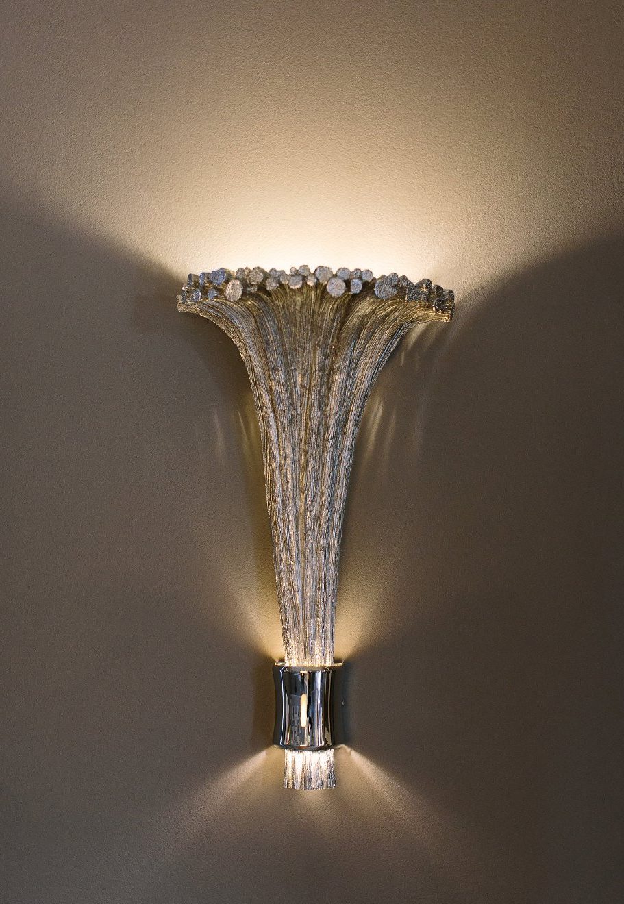 Un ensemble de trois appliques se décline en un jeu de corolles sculptées jaillissant les unes des autres. Un guéridon et une lampe à poser précieusement ciselés comme l’écorce d’un arbre complètent cette collection.