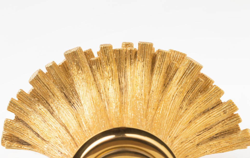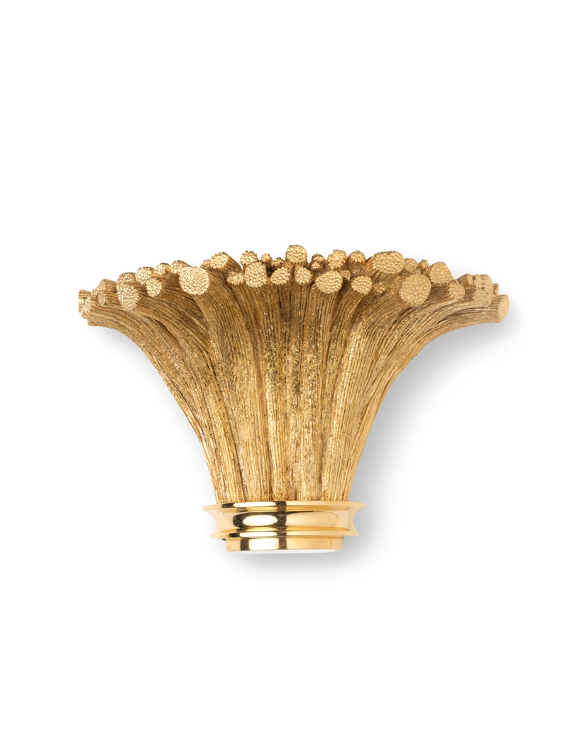 Un ensemble de trois appliques se décline en un jeu de corolles sculptées jaillissant les unes des autres. Un guéridon et une lampe à poser précieusement ciselés comme l’écorce d’un arbre complètent cette collection.