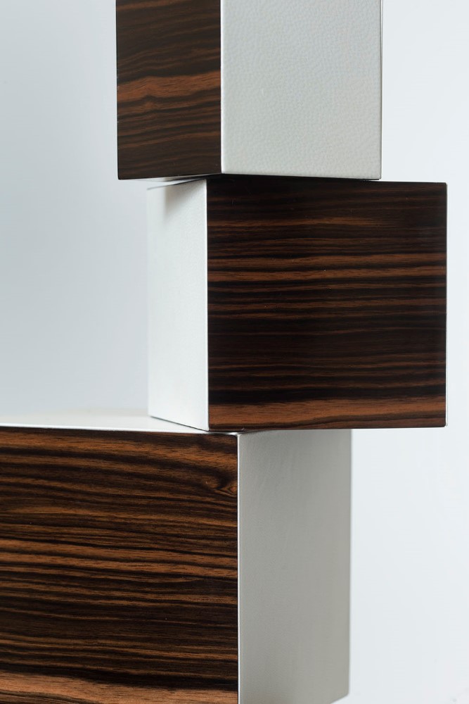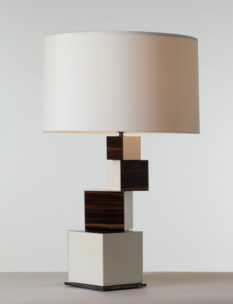 La lampe Babylone est sculptée dans le parchemin et l’ébène de Macassar.