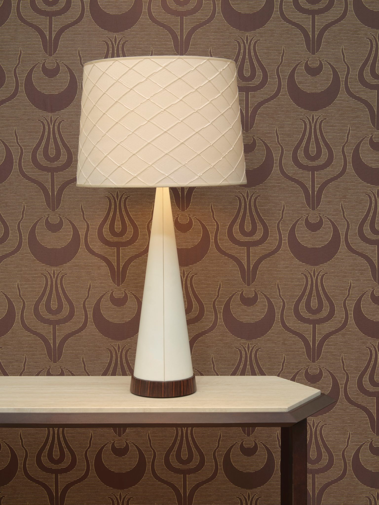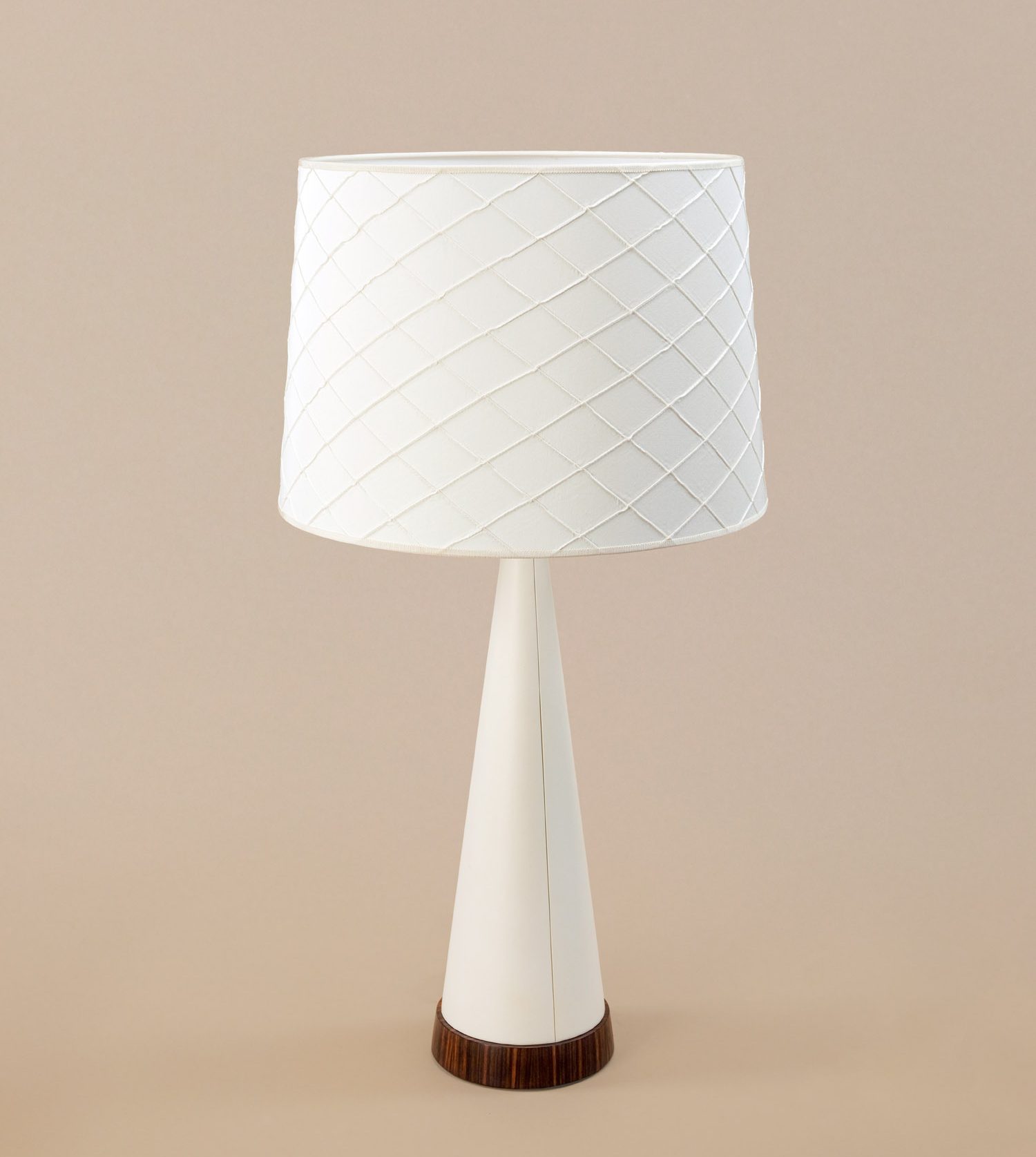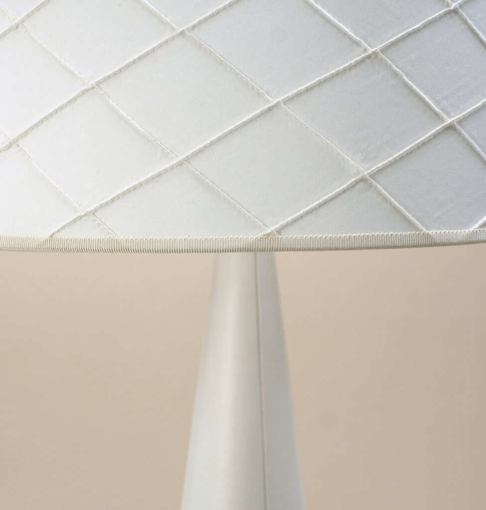 L’abat-jour en soie sauvage, couronne la lampe comme un chapeau savamment cousu de losanges…
