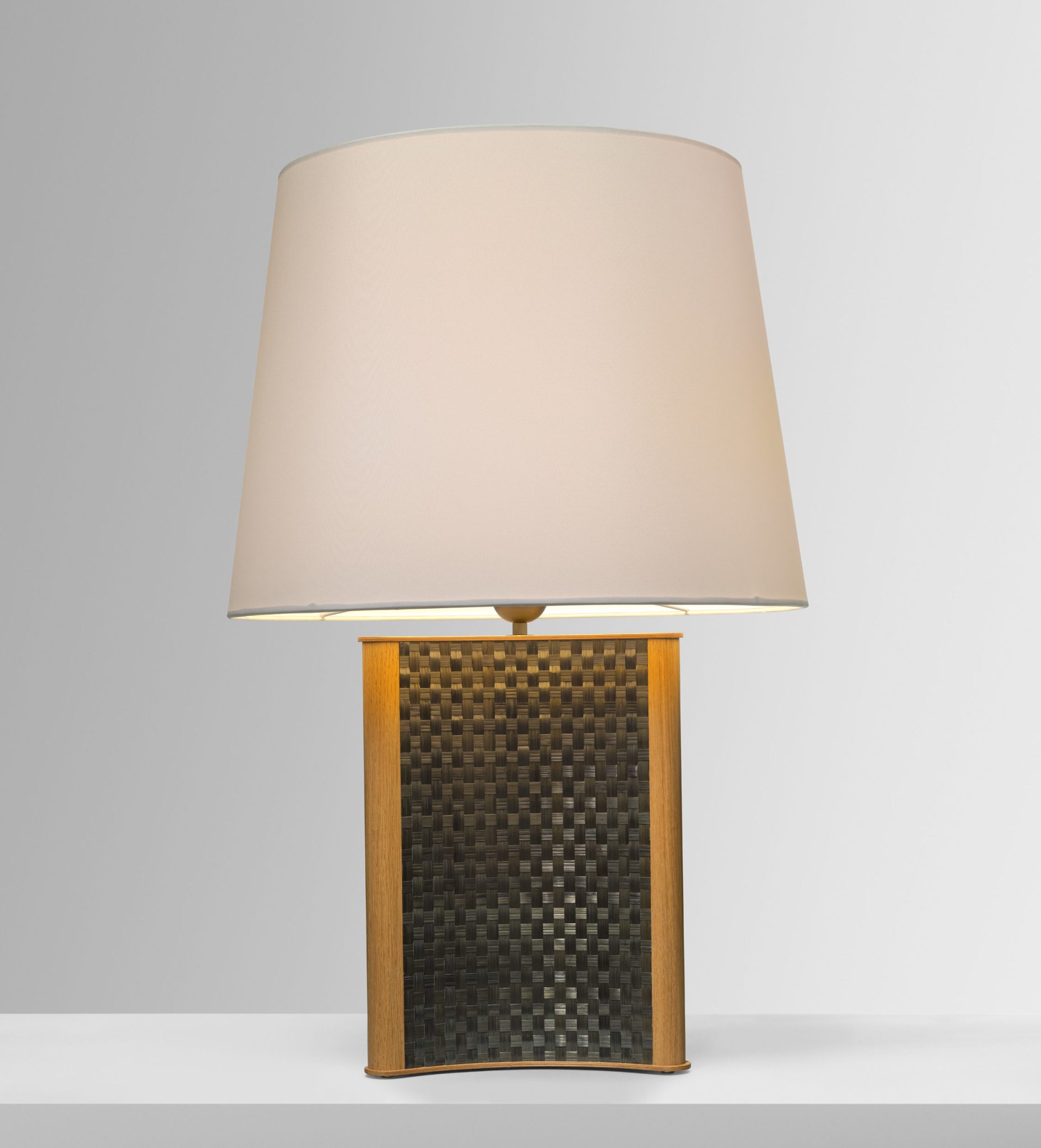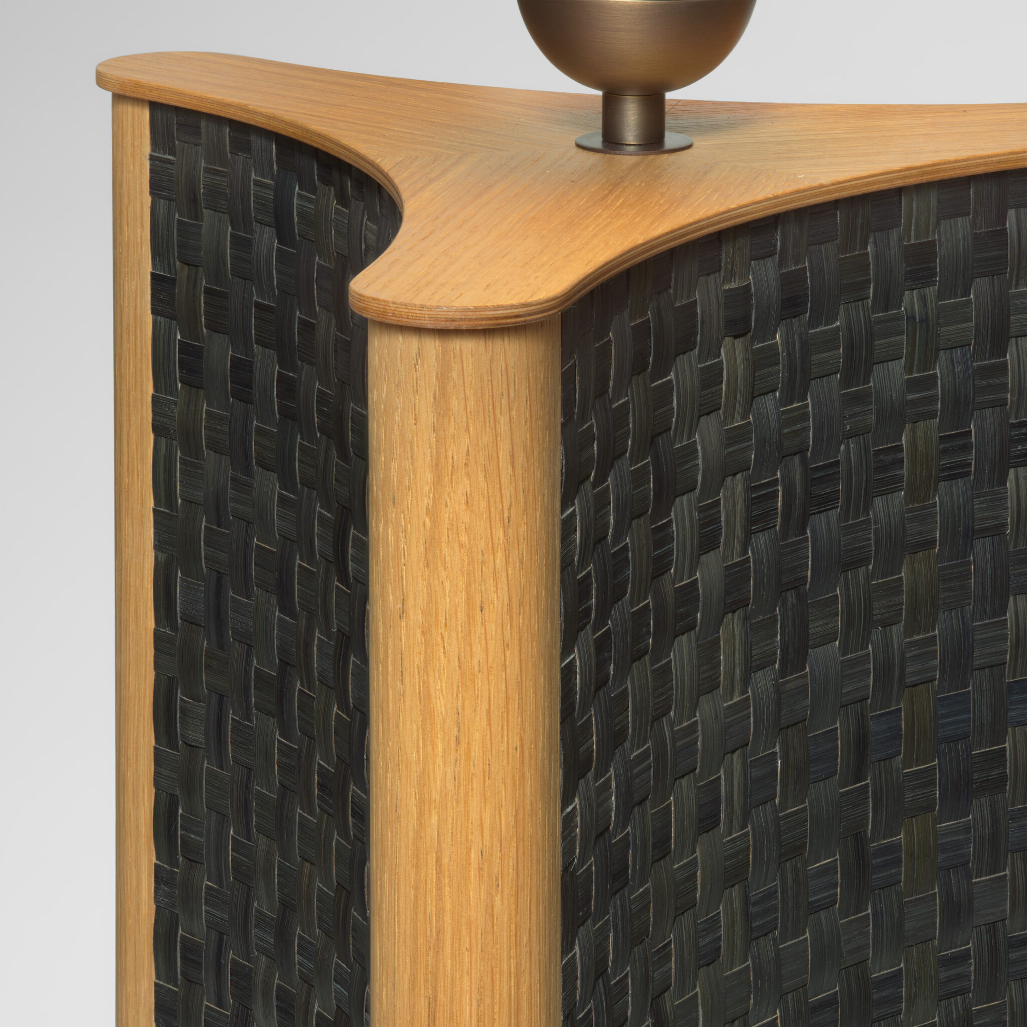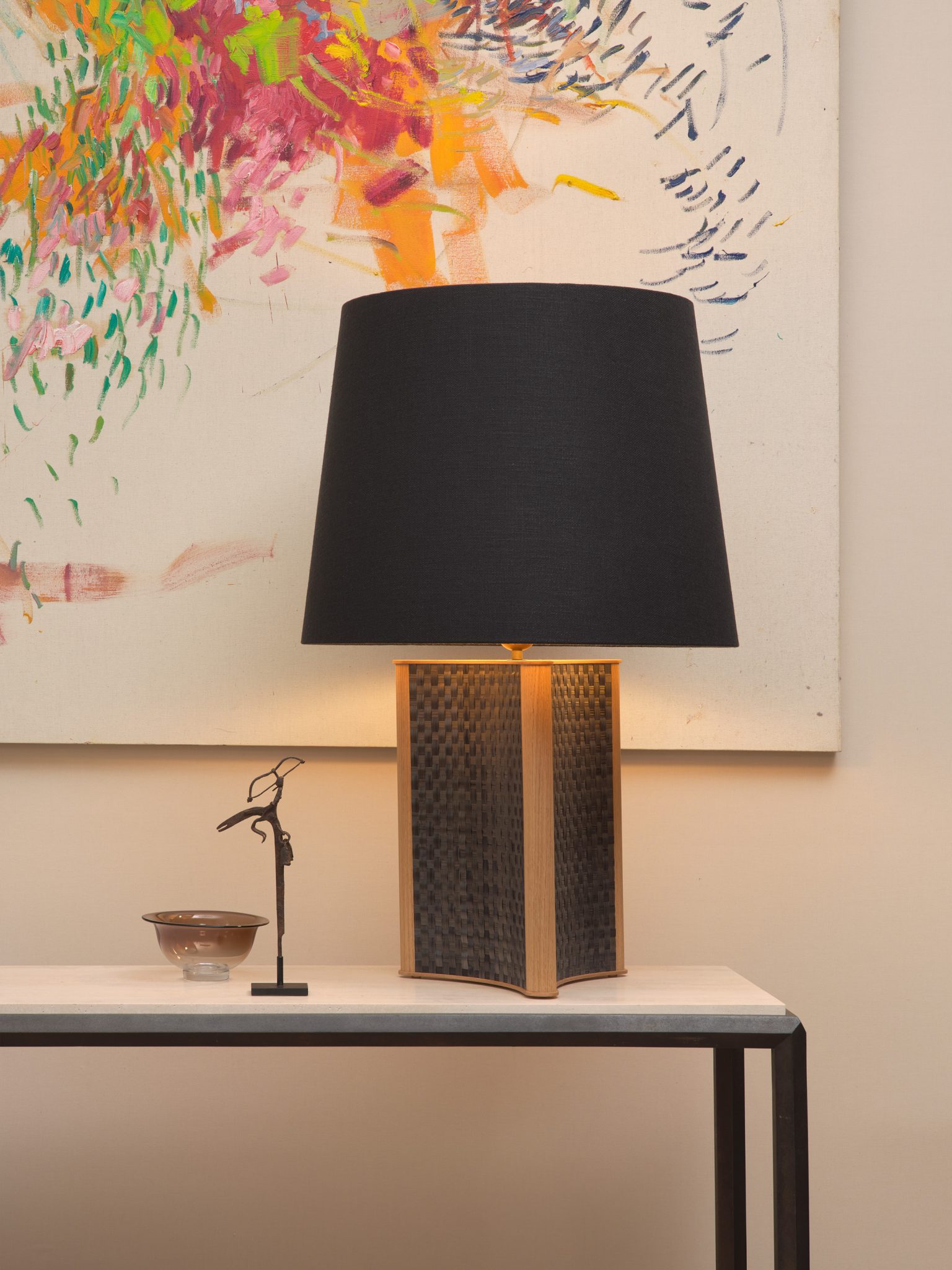 The Etoile lamp is adorned on its three curved sides with a delicate weave of dyed rye straw which shimmers discreetly between light and shadow.