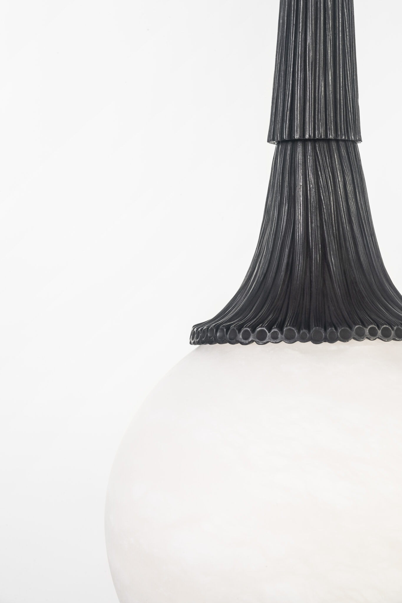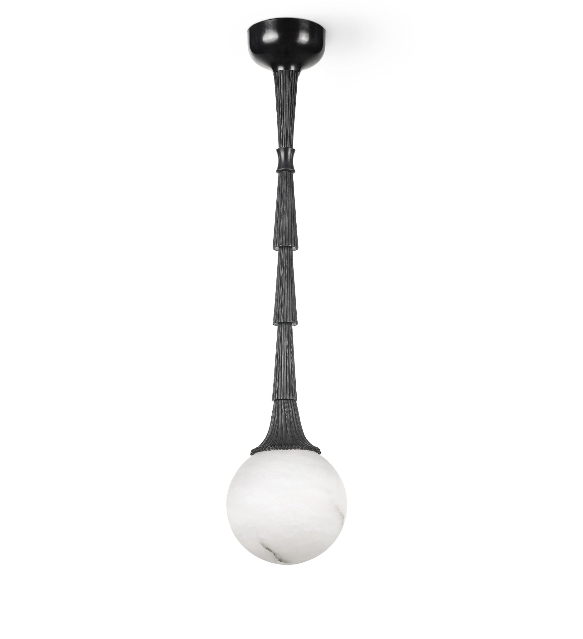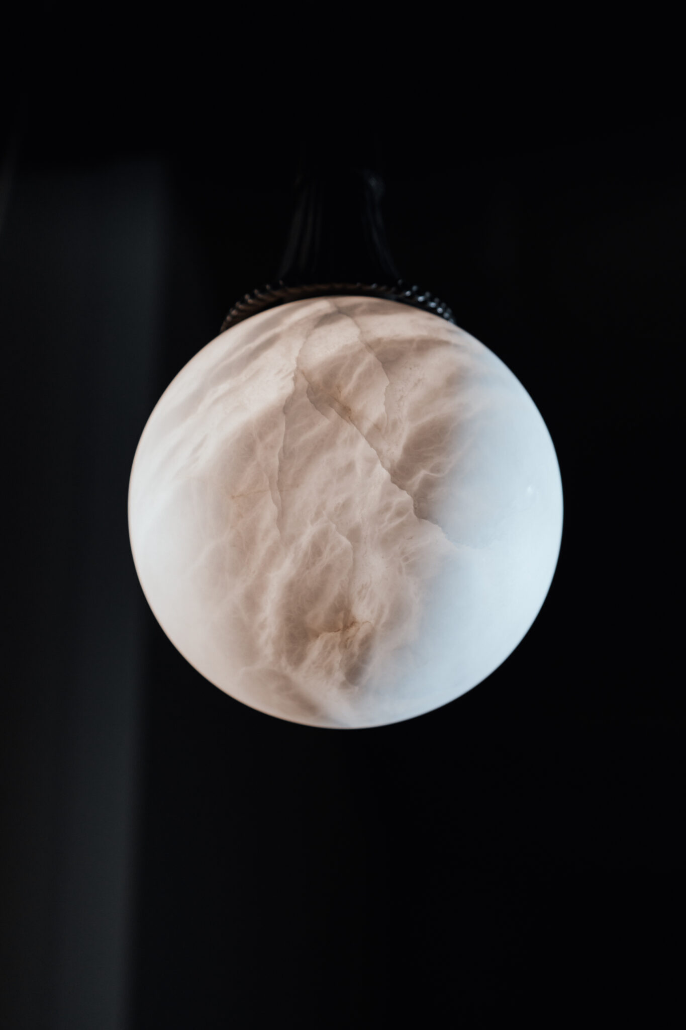 This collection offers a unique combination of bronze and alabaster. The light sources are transformed into spheres sculpted in veined alabaster, providing a mysterious and poetic light like that of full moon nights… To the graphic rhythm of these moons is added the graceful silhouette of hand-chiseled and patinated bronze cones.
