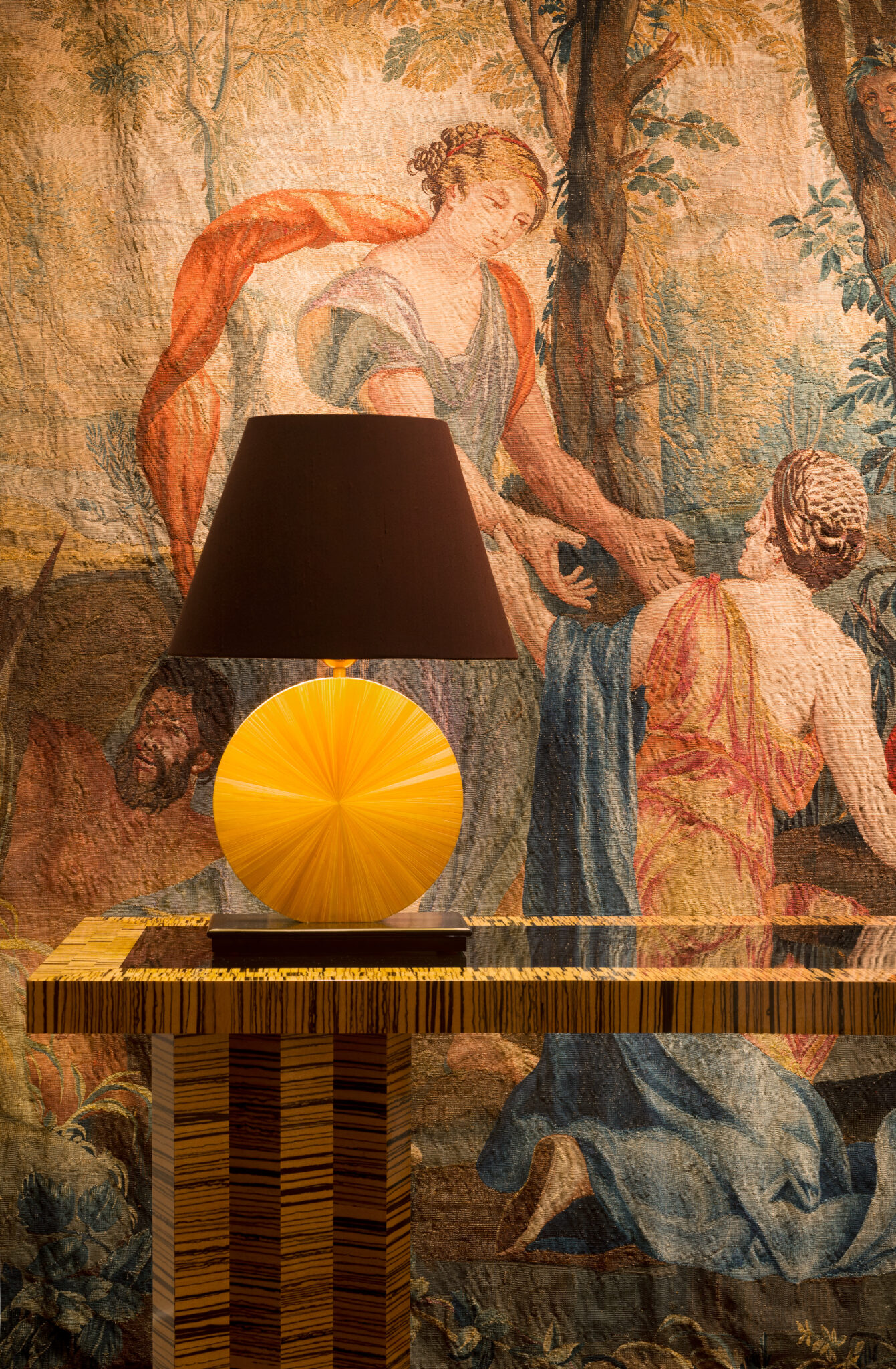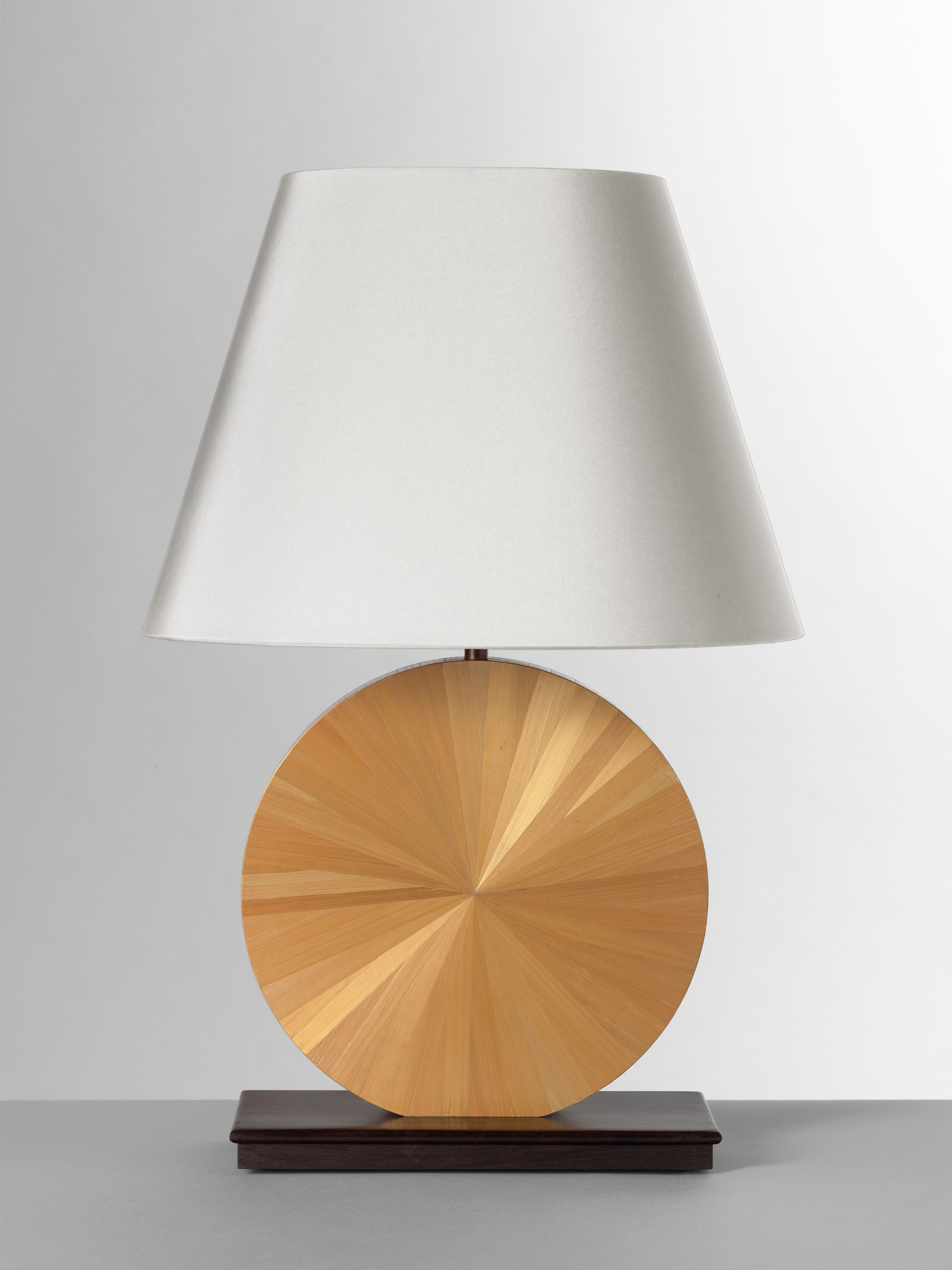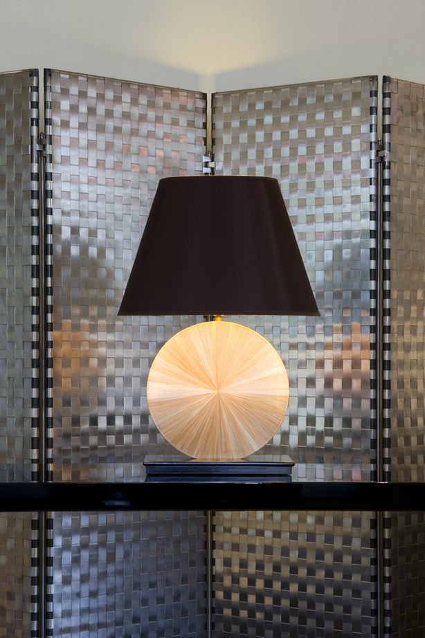 La marqueterie orne les deux faces de la lampe, car c’est encore plus beau si la lampe est posée devant un miroir ou sur une console de milieu.