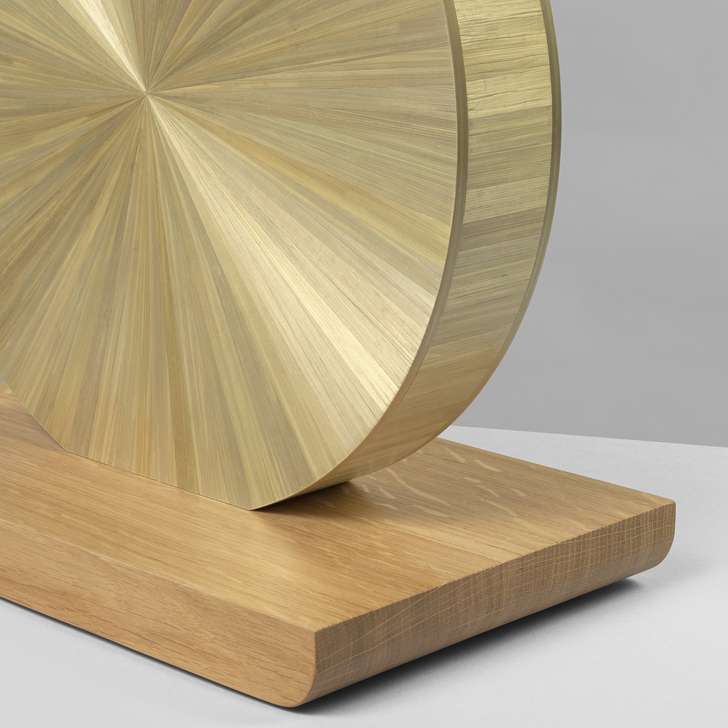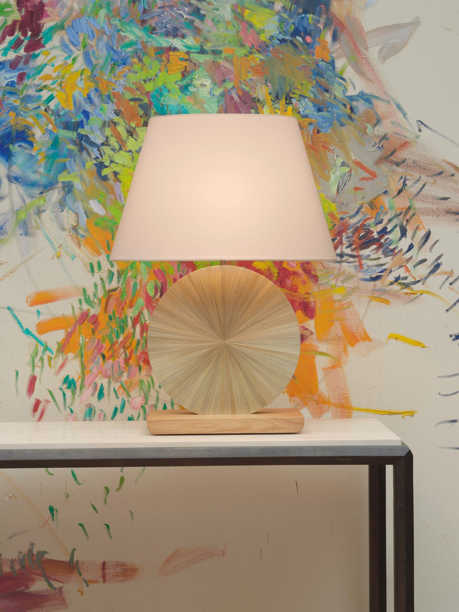 The Etoile lamp seems to have landed on its natural oak base, whose delicately raised edges resemble a canoe. The splendid straw marquetry sun combines plant-like hues reminiscent of fresh meadow grass.