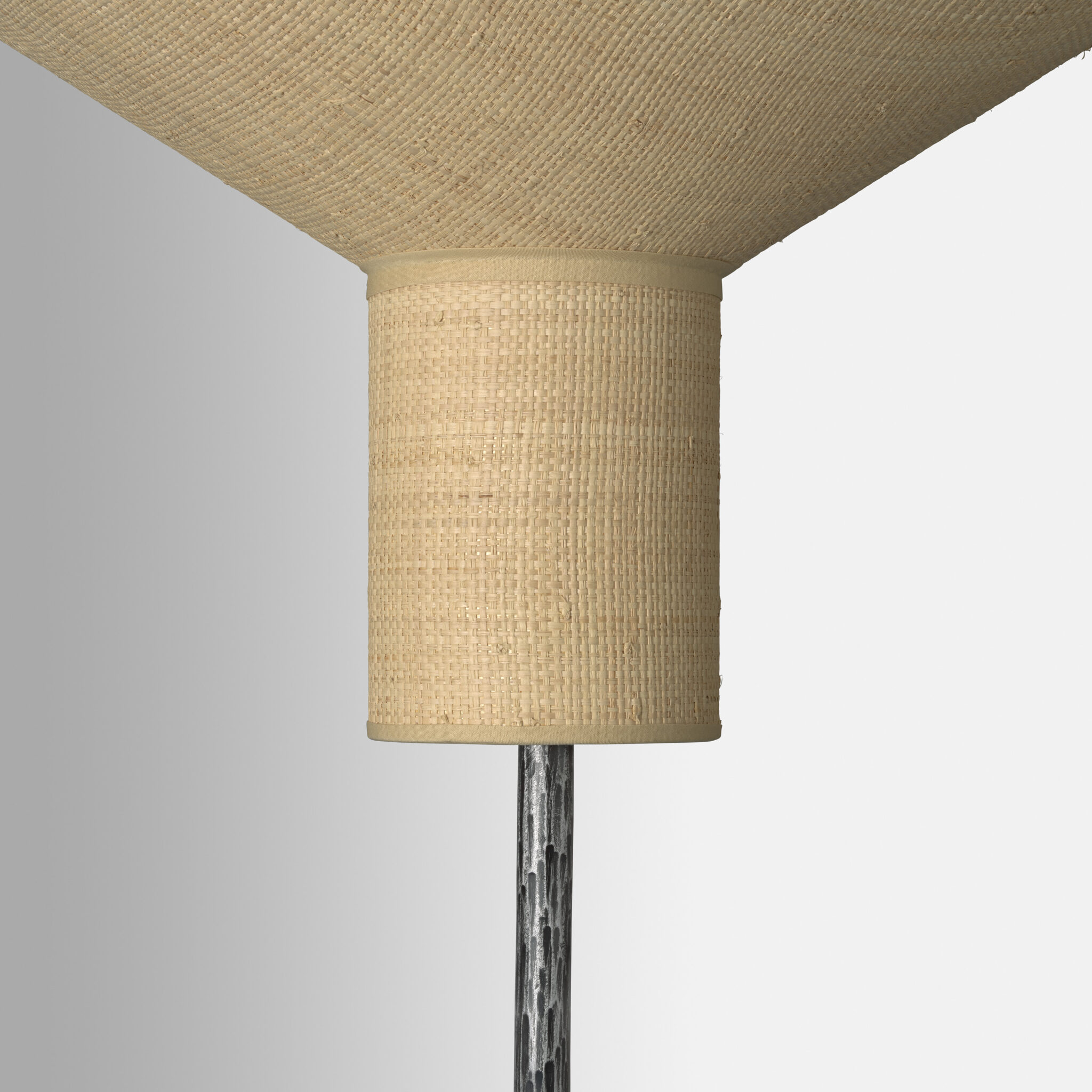 Up there, like an upside-down hat, a large woven raffia lampshade opens towards the sky and diffuses its golden light through the woven straw.