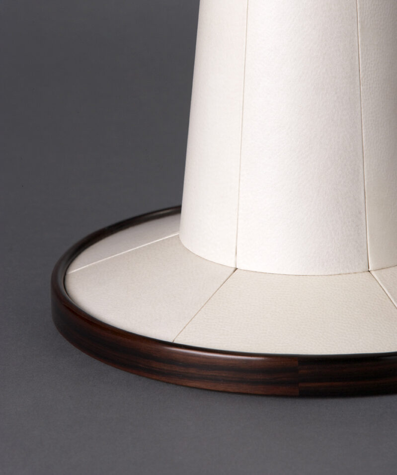 La lampe Tanis met à l’honneur le parchemin, qui nécessite le savoir-faire d’un maître en ébénisterie pour préparer les peaux de parchemin, les sélectionner, les tailler puis les coller sur le meuble. A l’origine, le parchemin était utilisé pour servir de support à l’écriture, avant que ne soit inventé le papier. Succédant au papyrus, principal médium de l’écriture en occident jusqu’au VII siècle, le parchemin a été abondamment utilisé durant tout le Moyen Âge, notamment par les moines qui consacraient une grande partie de leur temps à réaliser des manuscrits enluminés. C’est grâce au parchemin que les grands textes philosophiques, scientifiques et politiques de l’antiquité grecque et romaine ont été conservés et diffusés dans toute l’Europe.