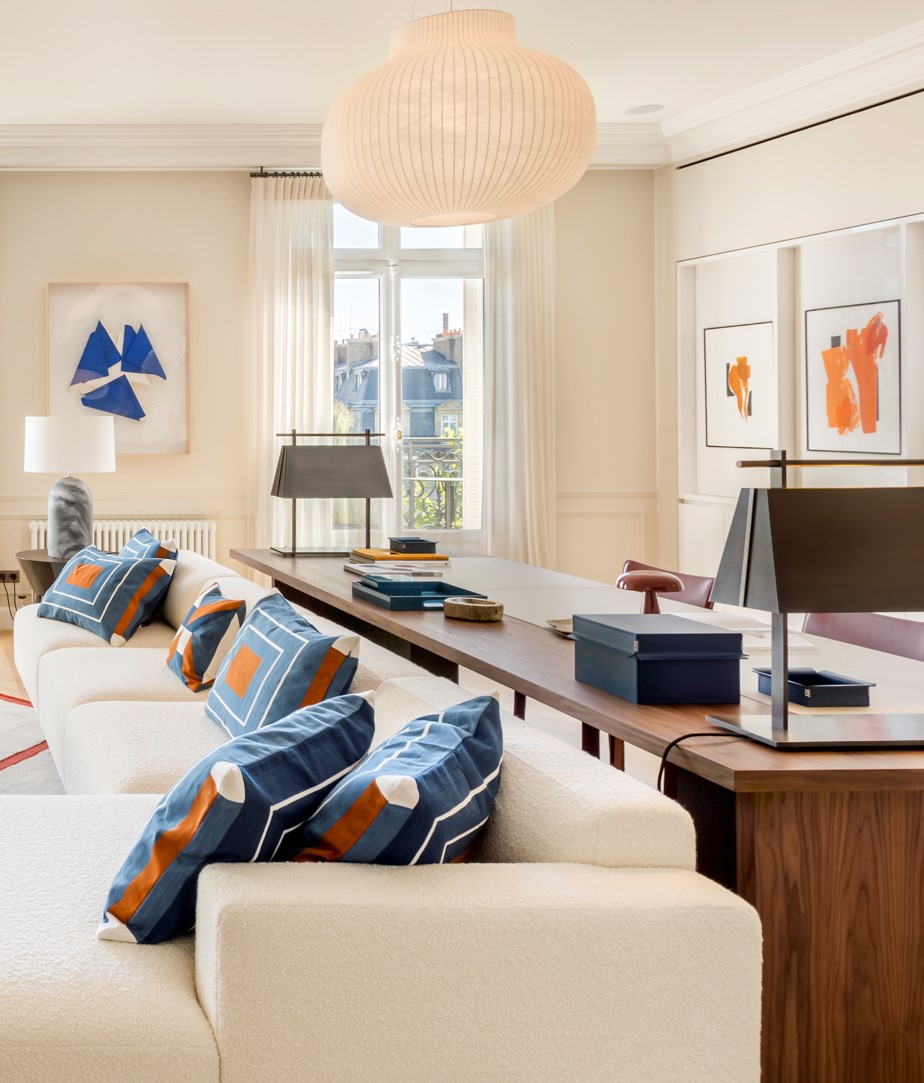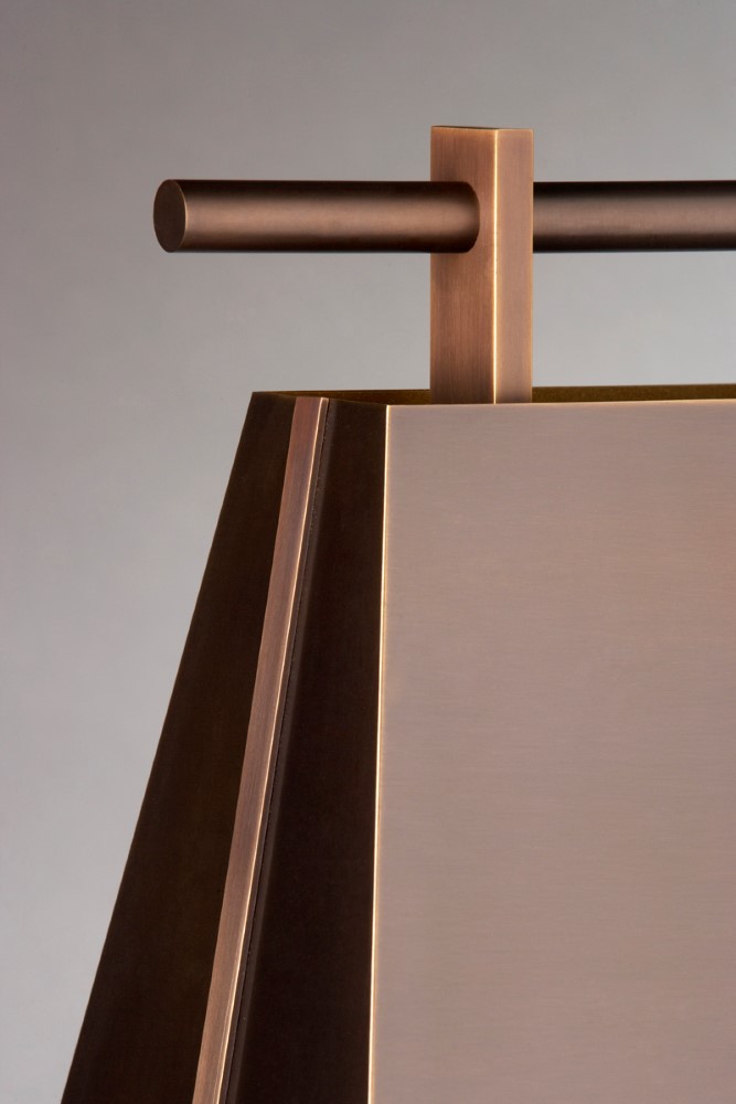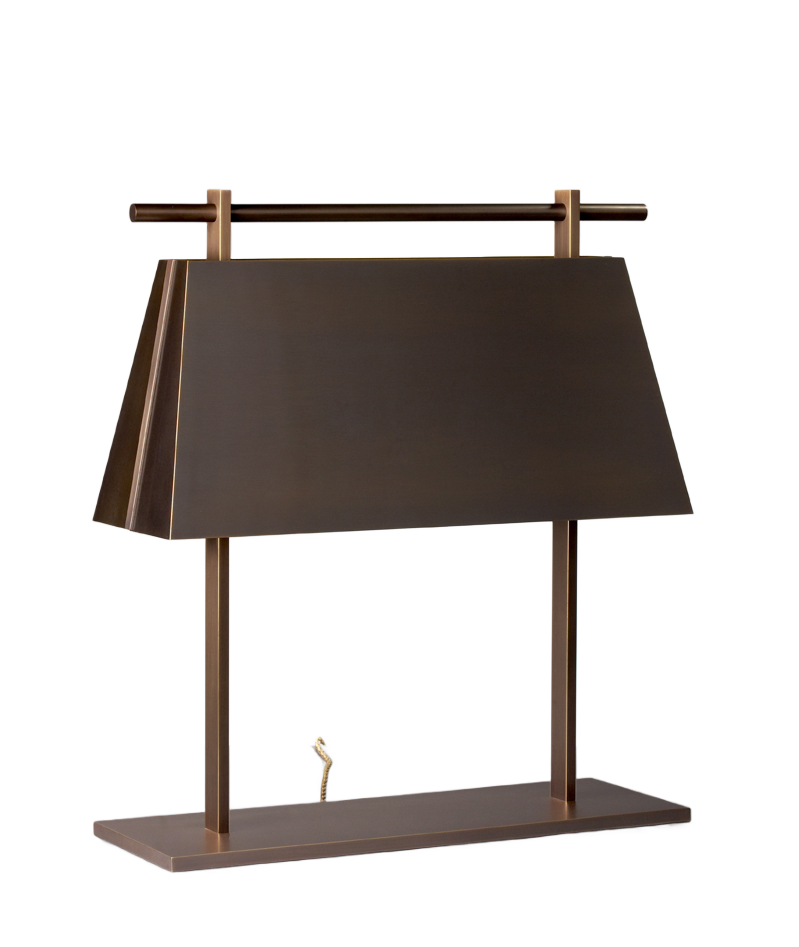 Ses lignes droites et nettes révèlent des proportions impeccables. La lumière cachée dans l’abat-jour de métal irise d’un halot doré le portique qui semble suspendu dans le vide. Aucun assemblage apparent, chaque pièce semble effleurer sa voisine.