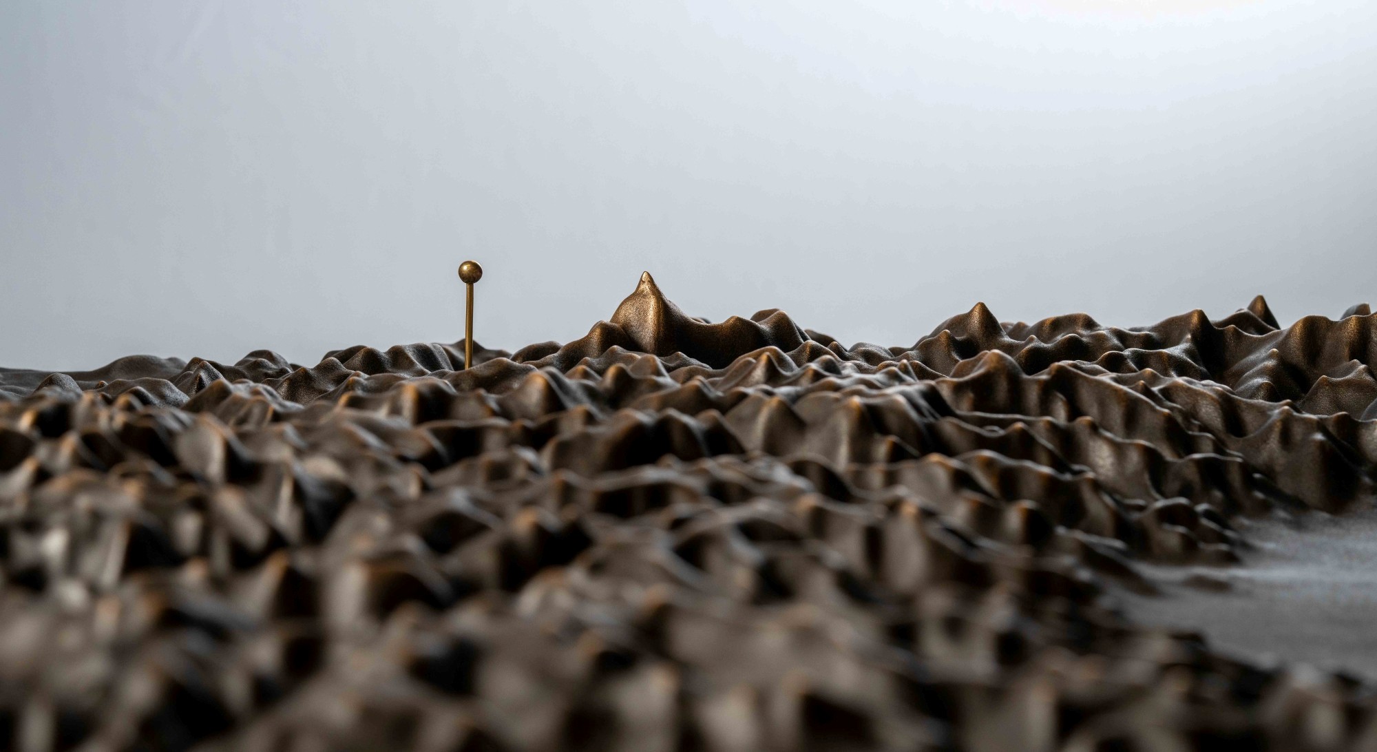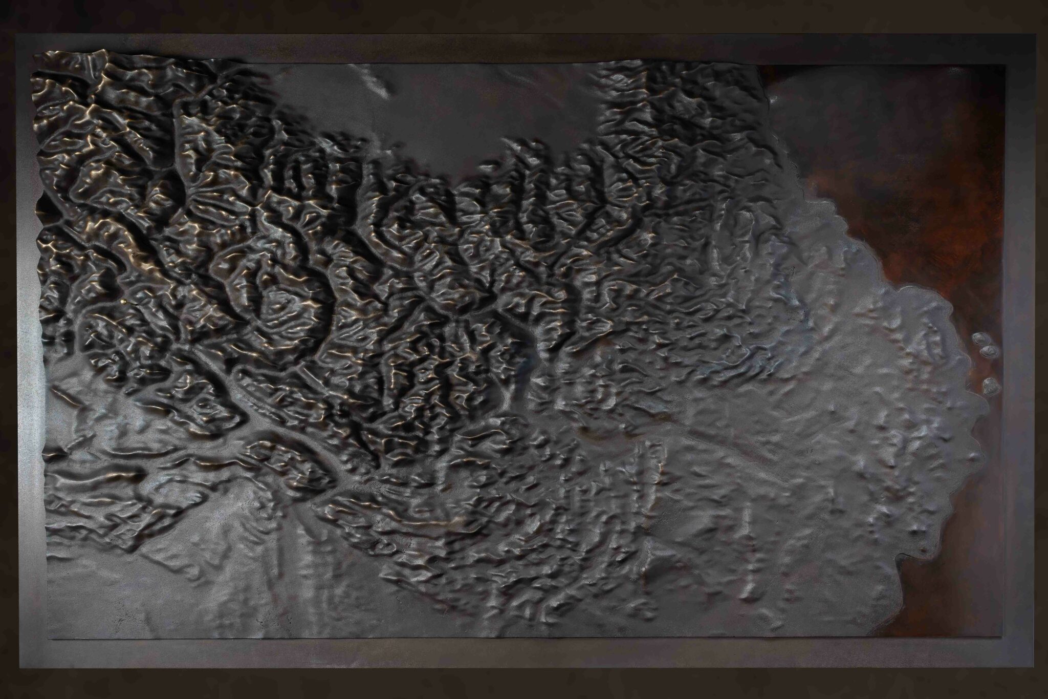 Numerous samples were made to find a particular texture for bronze that would allow for the representation of mountain areas, plains areas and sea areas.