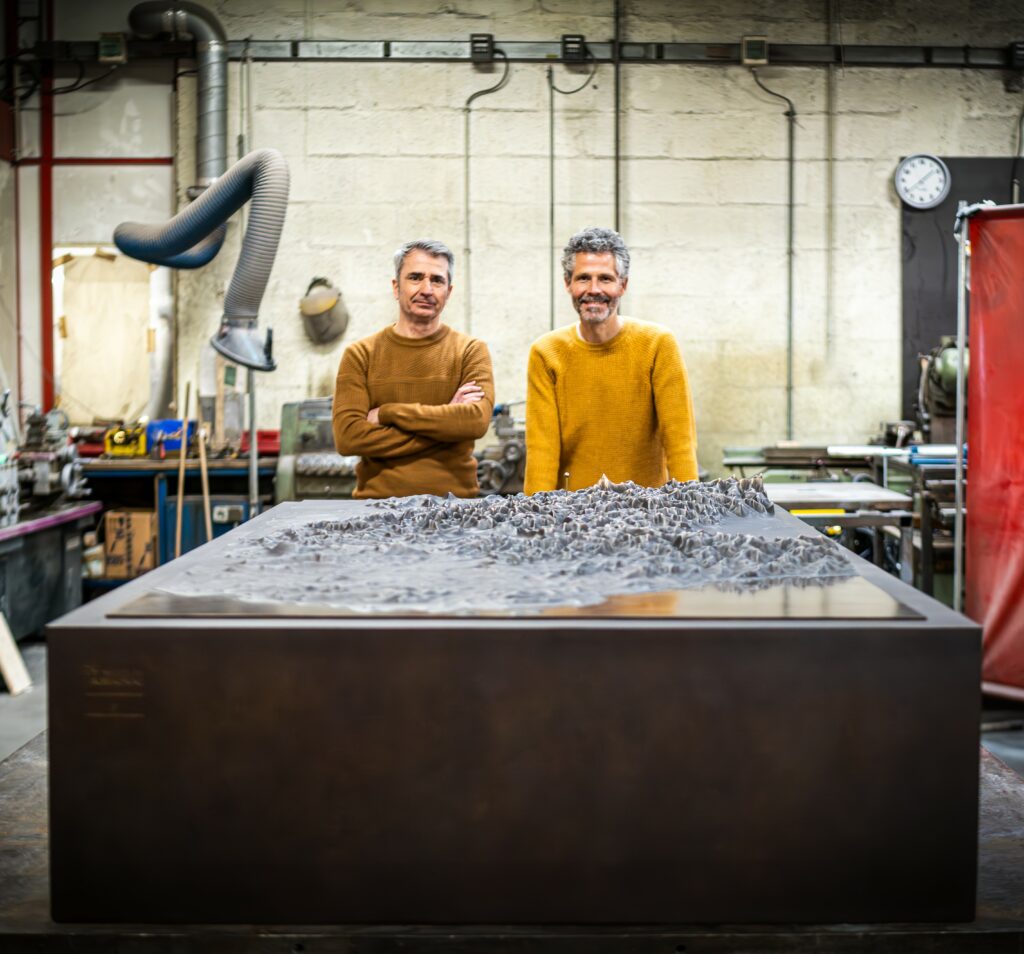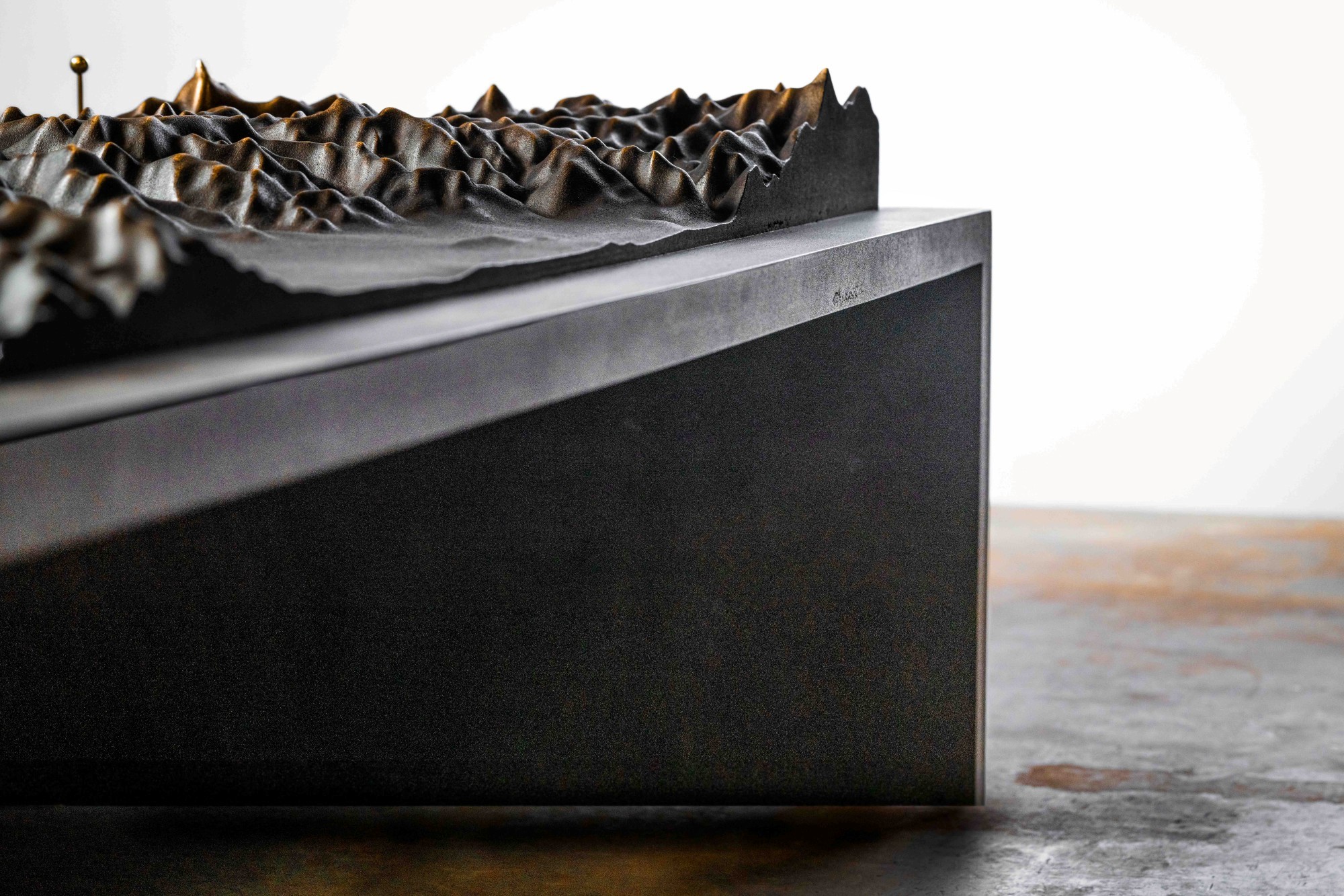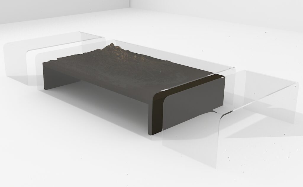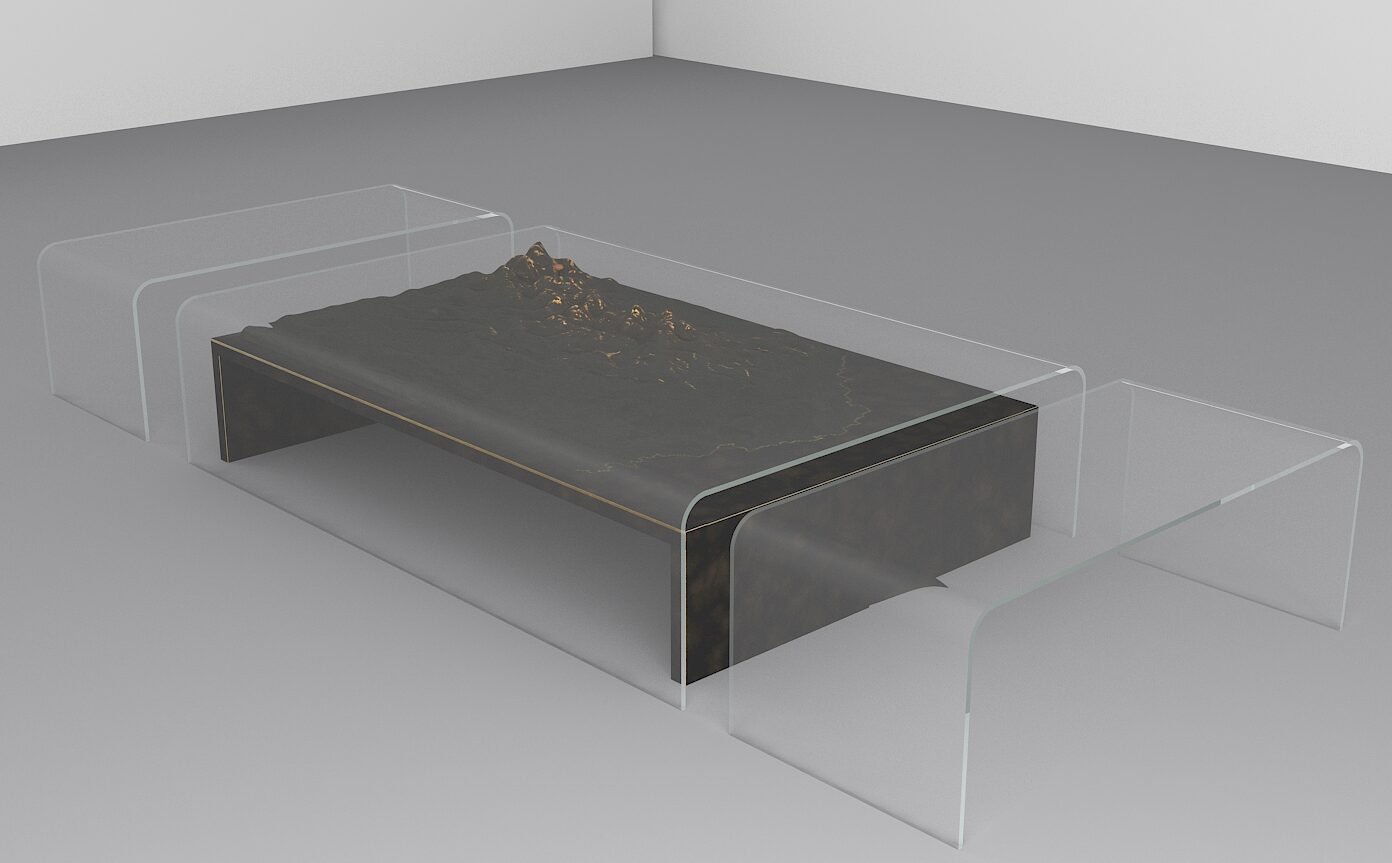 We are in the mountains, in a contemporary chalet: the owner asks me to design a coffee table that will be the focal point of his living room… I look at the snow-capped peaks through the windows, and the idea comes to me to represent the Alps in three dimensions as if I were seeing them from a cloud, a memory of my childhood fascination with maps…