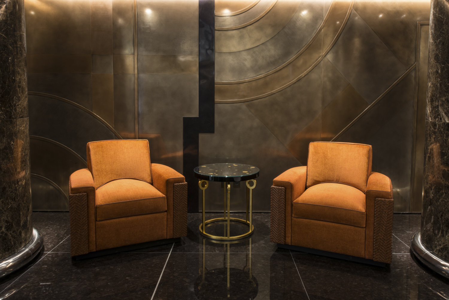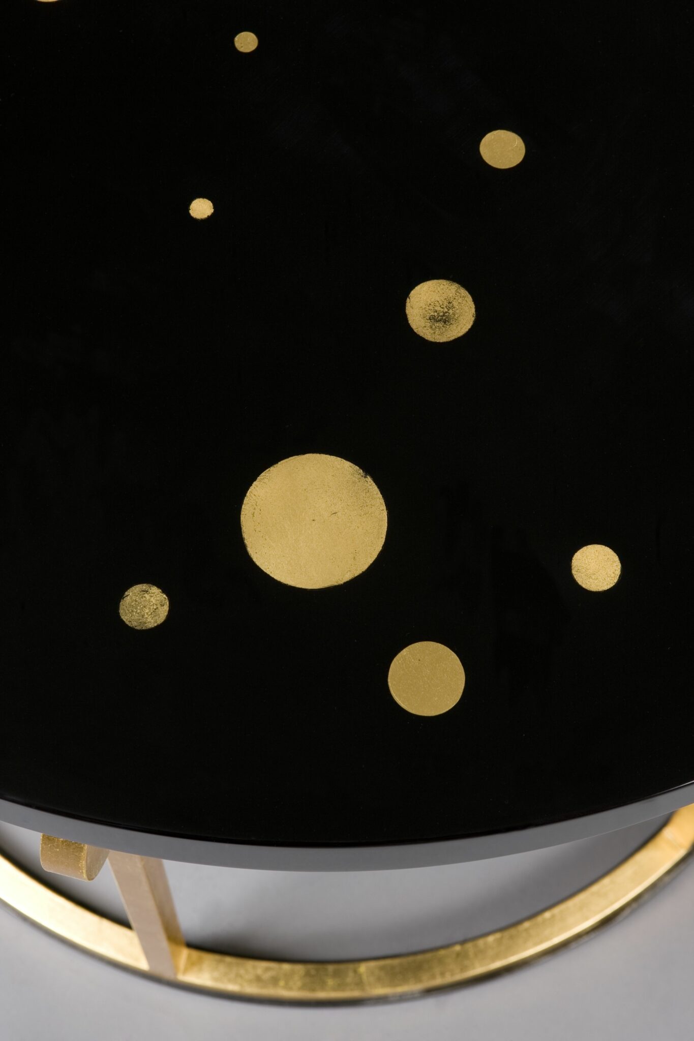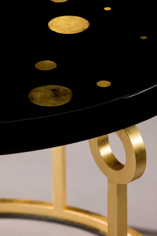 Le guéridon Atlas met à l’honneur deux savoir-faire traditionnels des Arts décoratifs : le décor à la feuille d’or sur acier, et le décor à la feuille d’or couché sous laque. Le motif de planètes est réalisé avec de la feuille d’or posée sur un fond de laque noir, puis couché sous un fond de plusieurs couches de laque patiemment appliquées et poncées pendant des heures jusqu’à obtenir cet effet de brillance et de profondeur incomparables qui fait la qualité d’une laque aux yeux des collectionneurs avertis.
