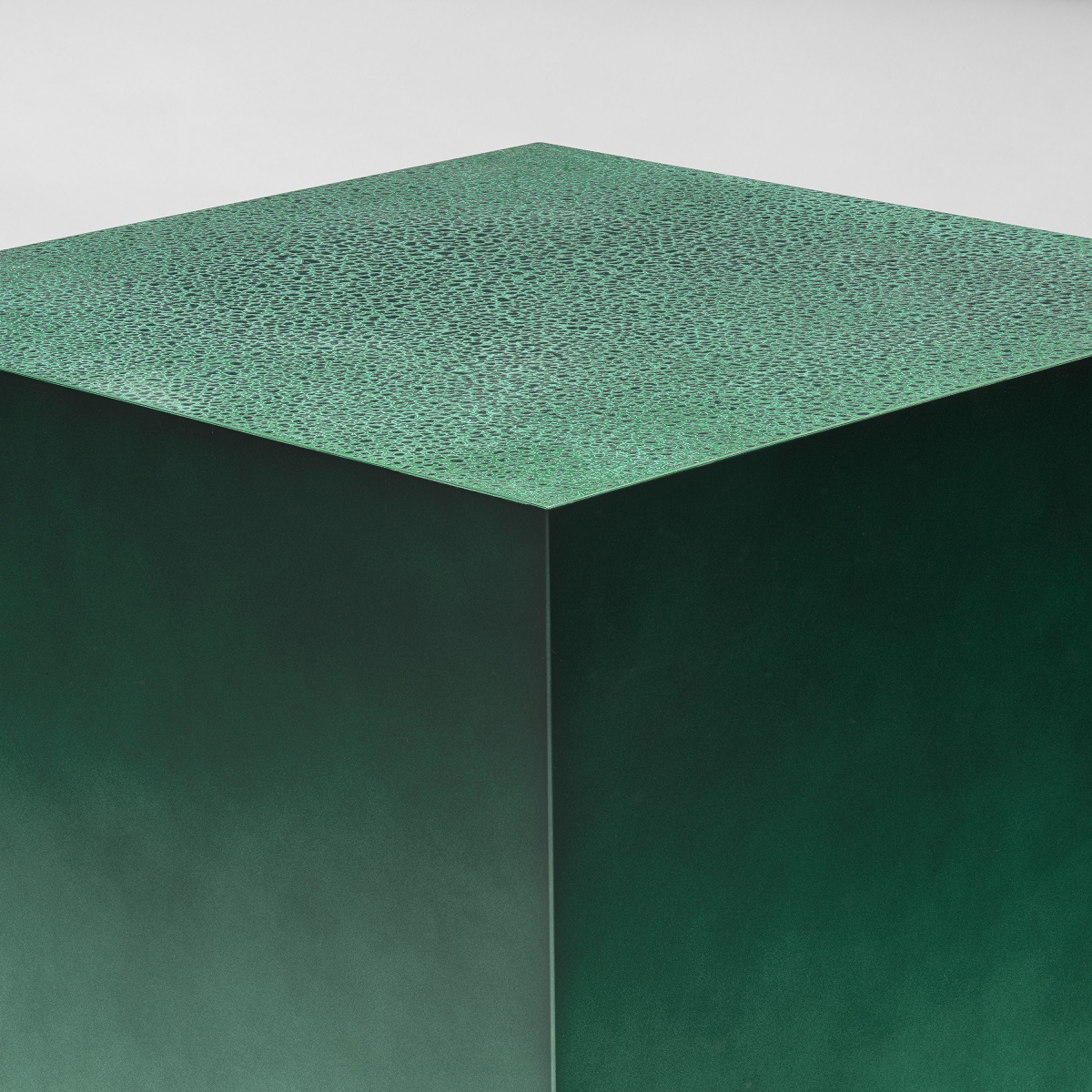 A subtle gradient from light to dark adorns the sides of the pedestal table, and rises to the top, decorated with a lacquer that I named "flake" because it brought back my memory of raindrops falling on the asphalt after a storm.