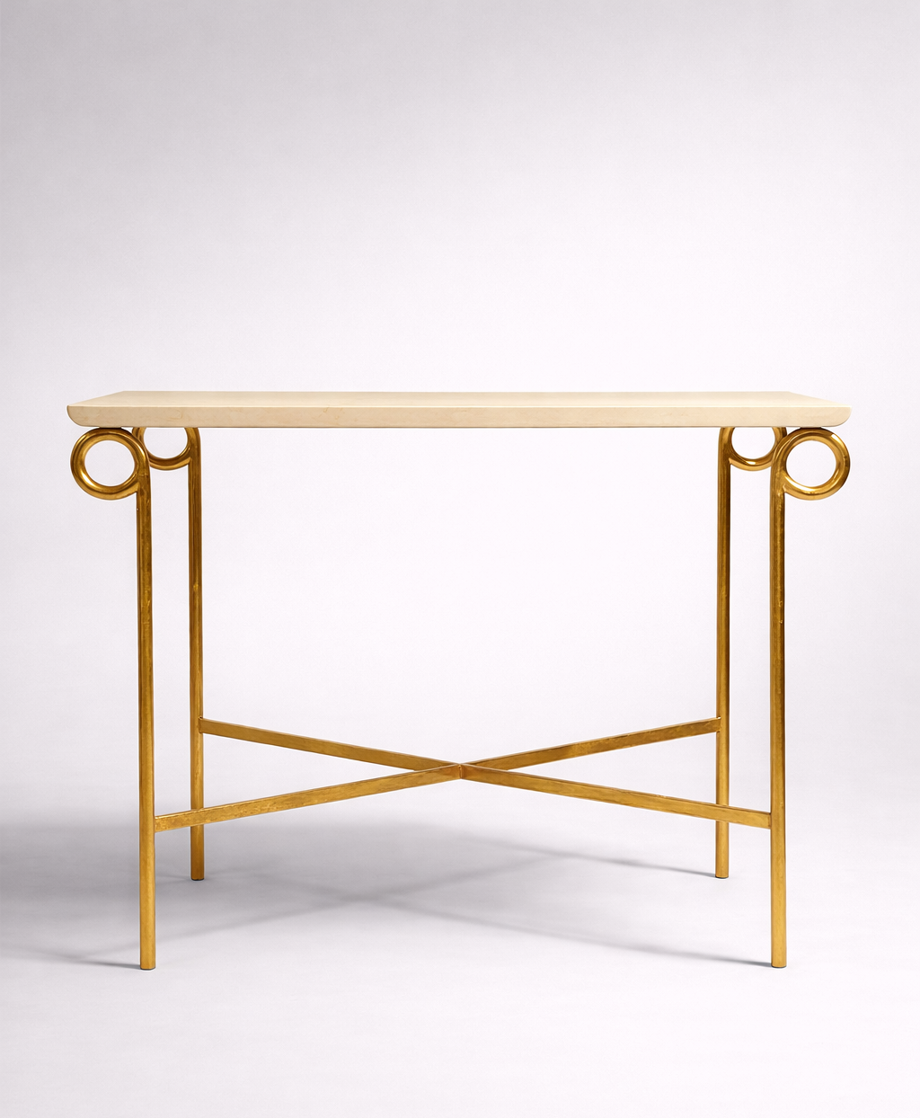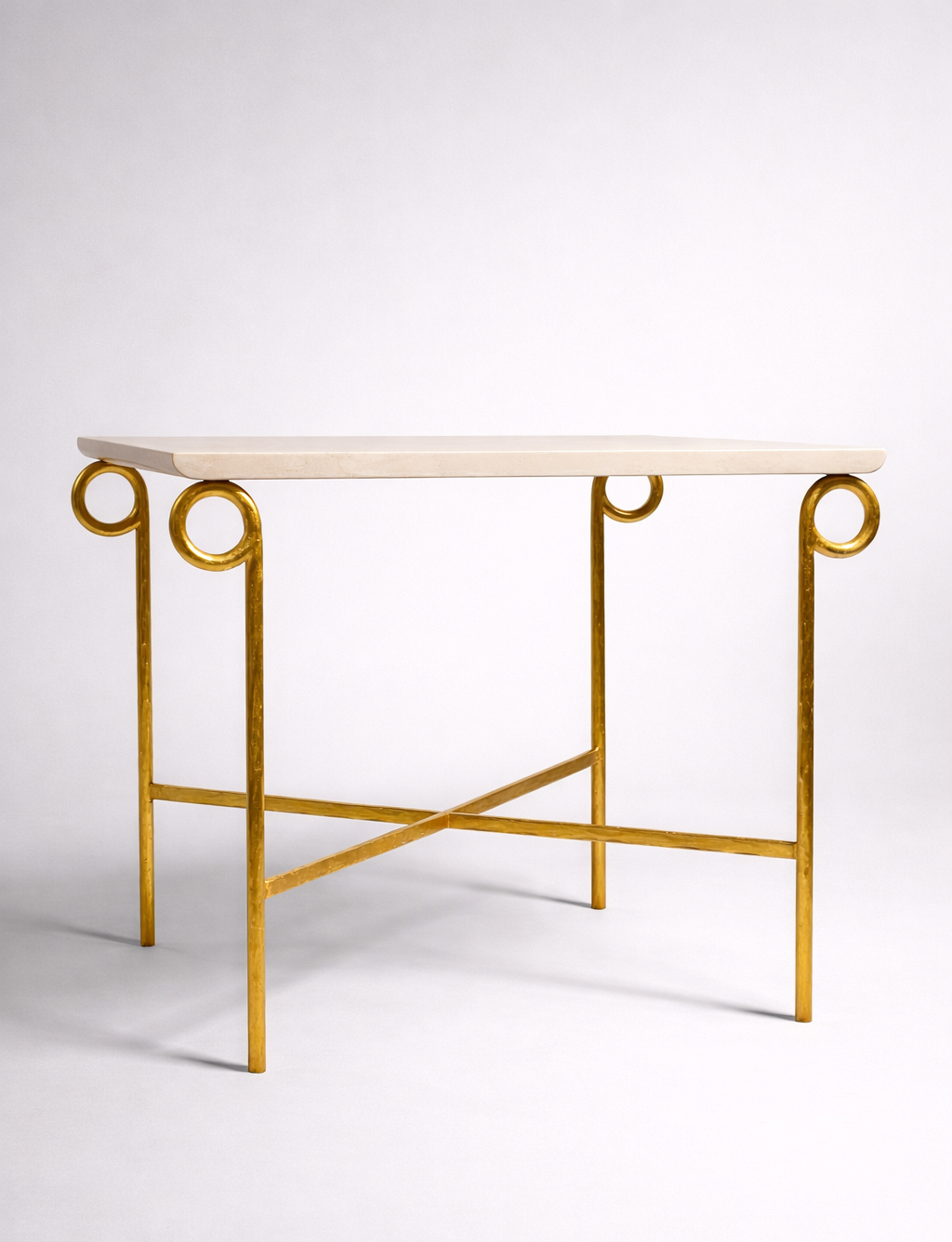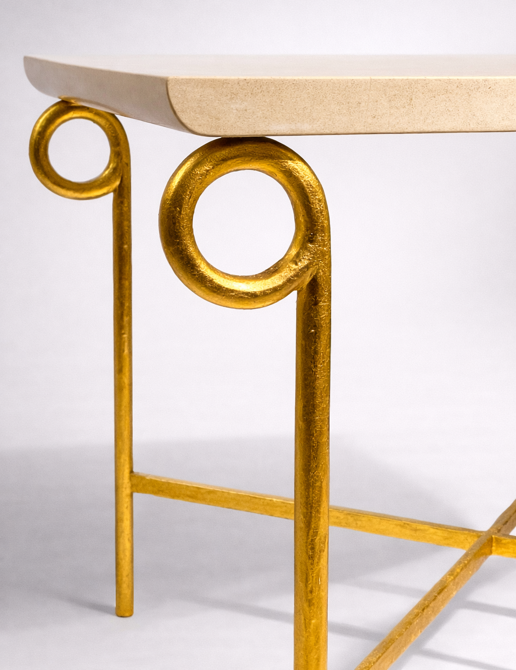 Le plateau aux bords délicatement relevés semble à peine effleurer les quatre anneaux dorés à la feuille d’or.