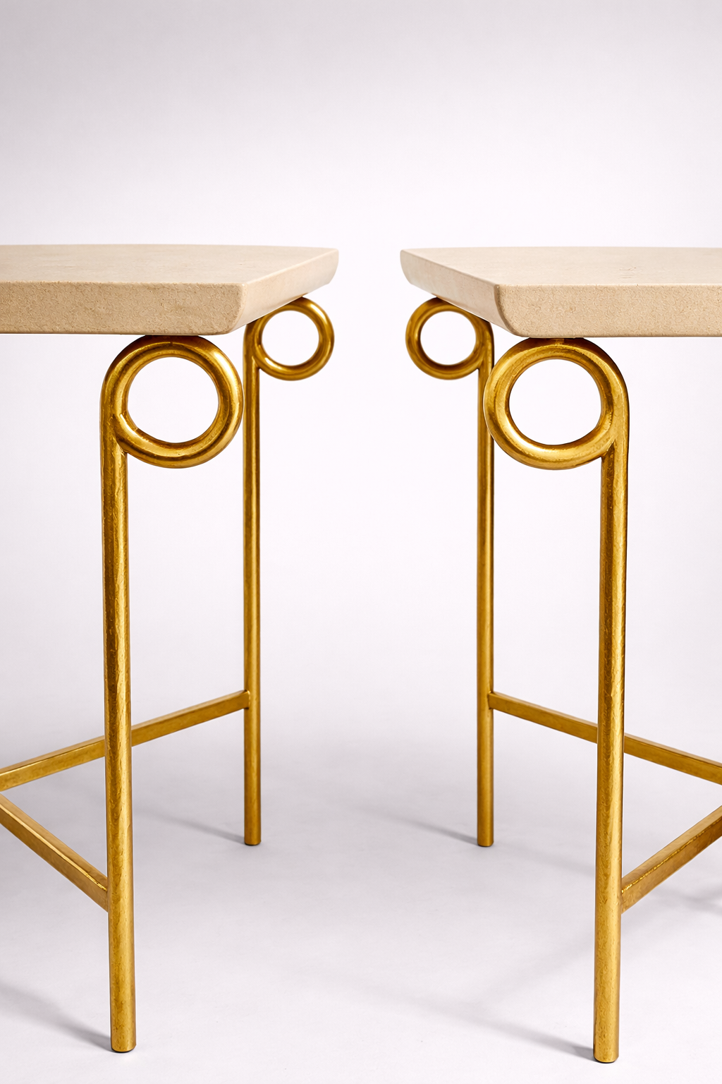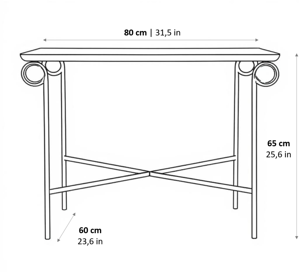 Sa silhouette dépouillée et très graphique évoque par des formes stylisées jusqu’à l’épure, les enroulements d’un chapiteau de colonne ionique surmonté d’un bloc de pierre de Bourgogne.