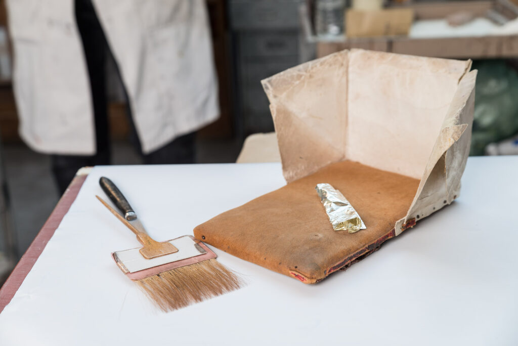 The gilder uses a sable brush to pick up each gold leaf without tearing it. It is a job requiring patience and precision.