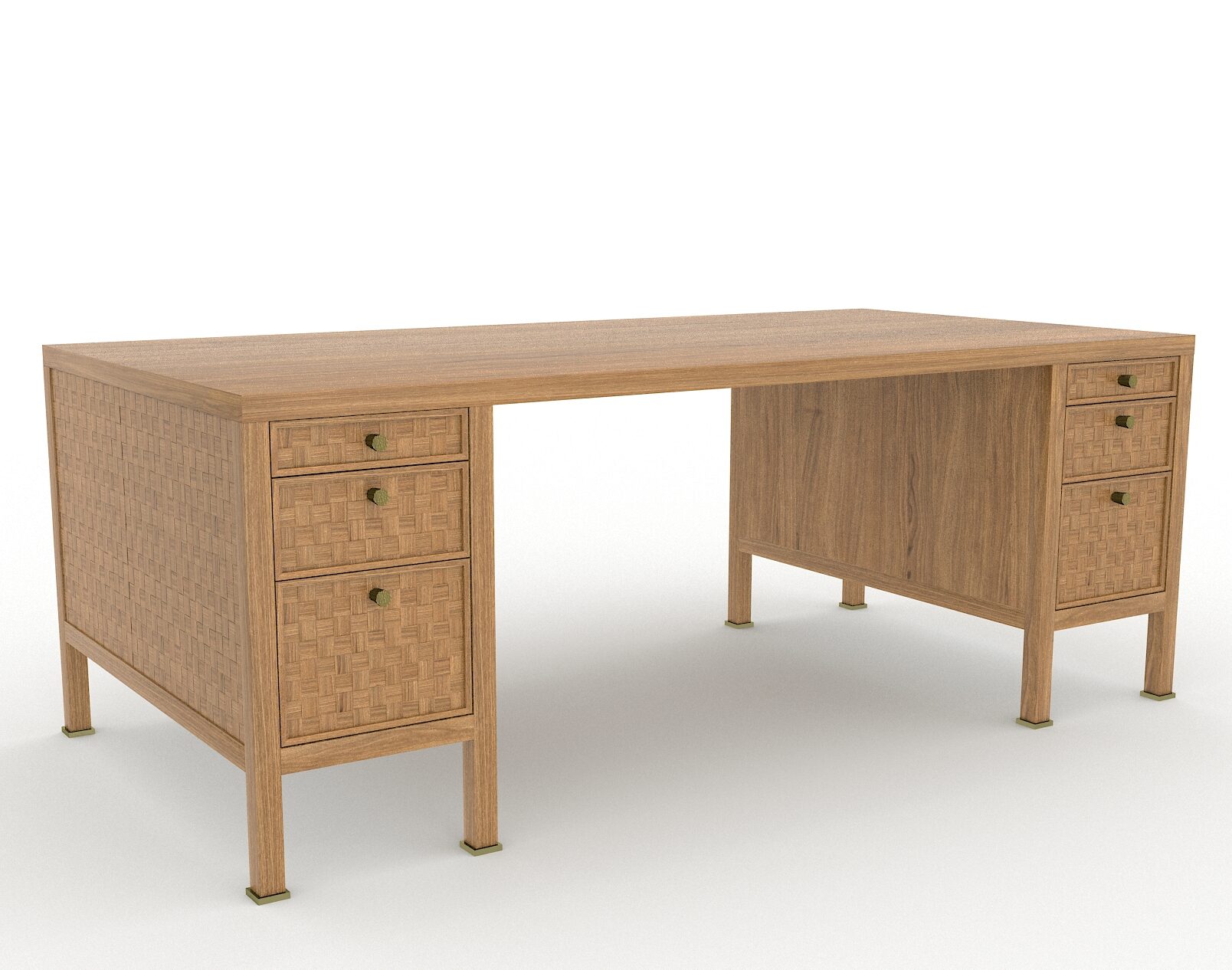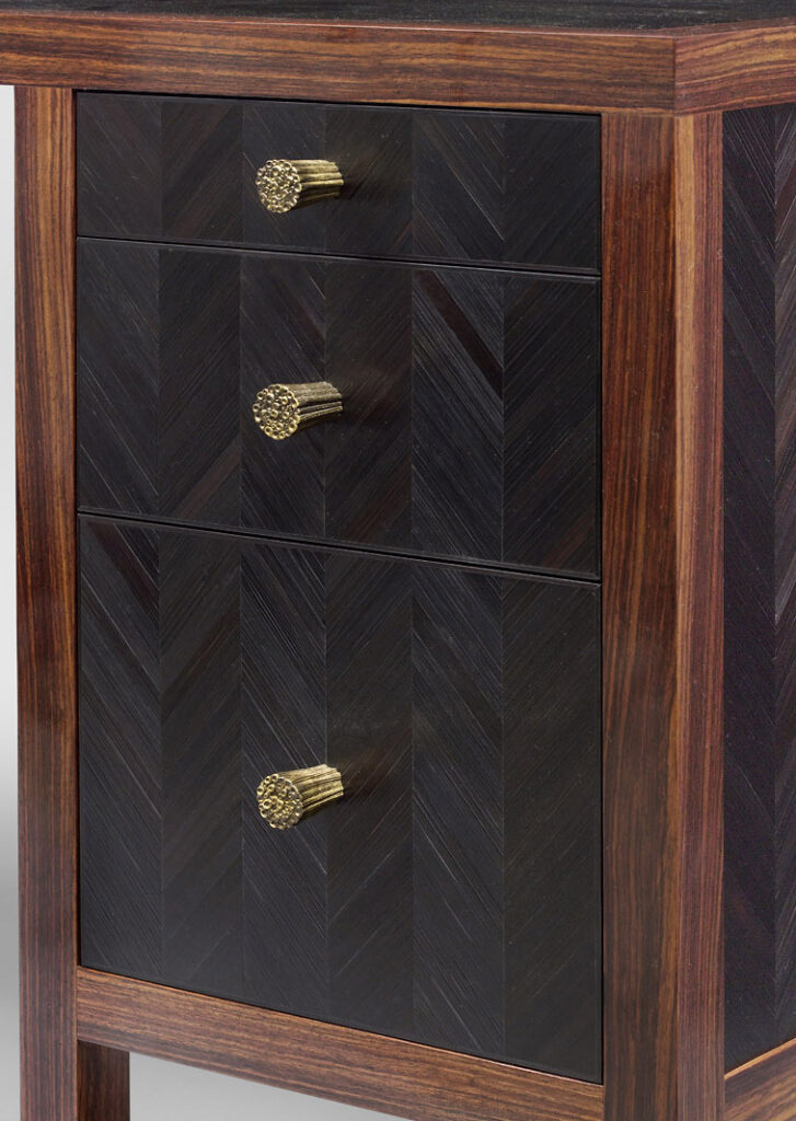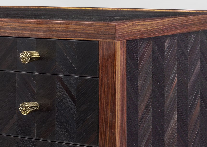 The Etna dressing table requires the expertise of our master cabinetmakers to create the facing of the piece of furniture with a straw marquetry in a chevron pattern.