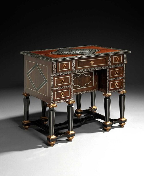 Cardinal Mazarin was Louis XIV’s chief minister… At the time, these desks were designed to be used at an angle, that is, with one knee below the writing surface, and another knee outside.