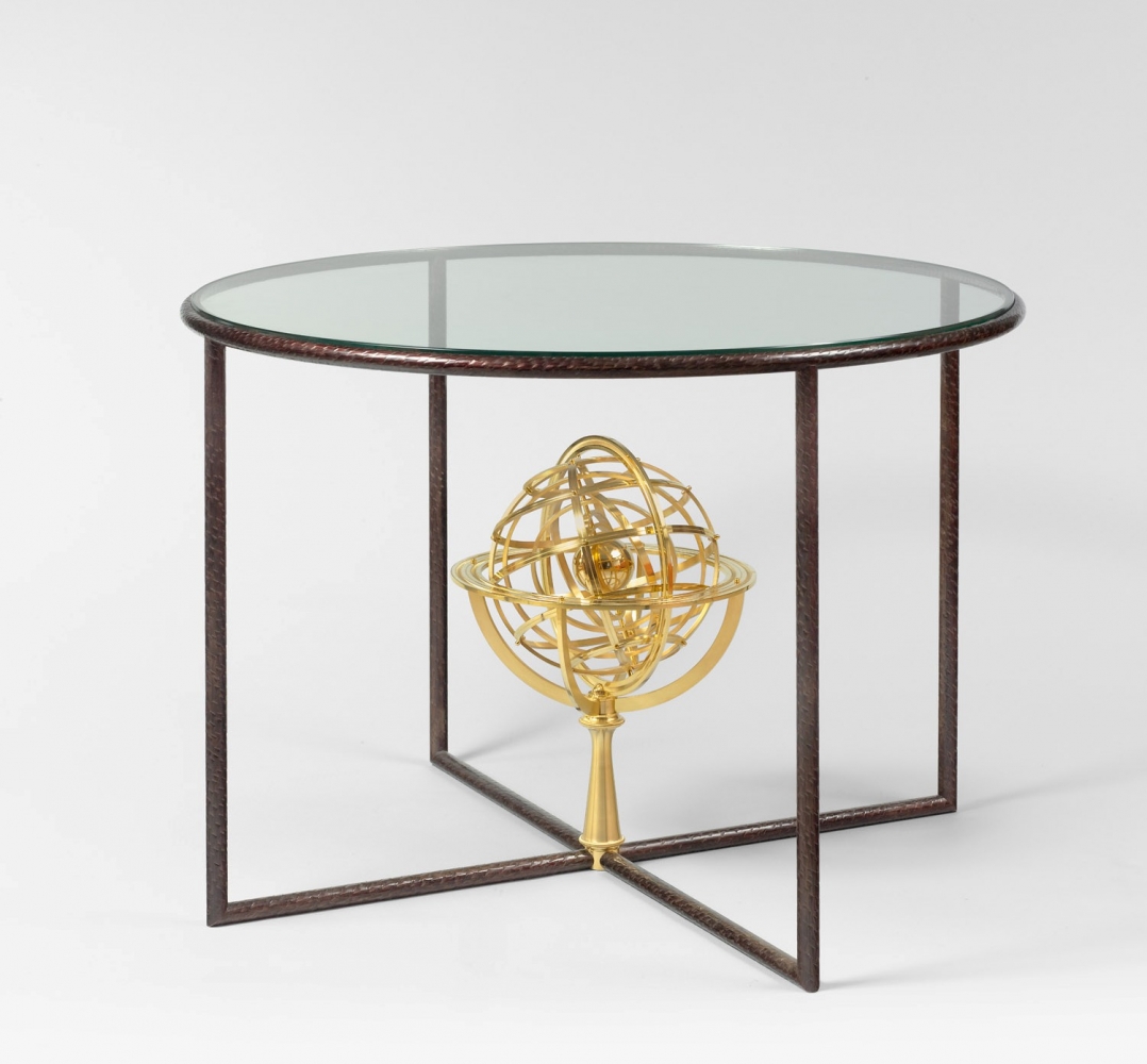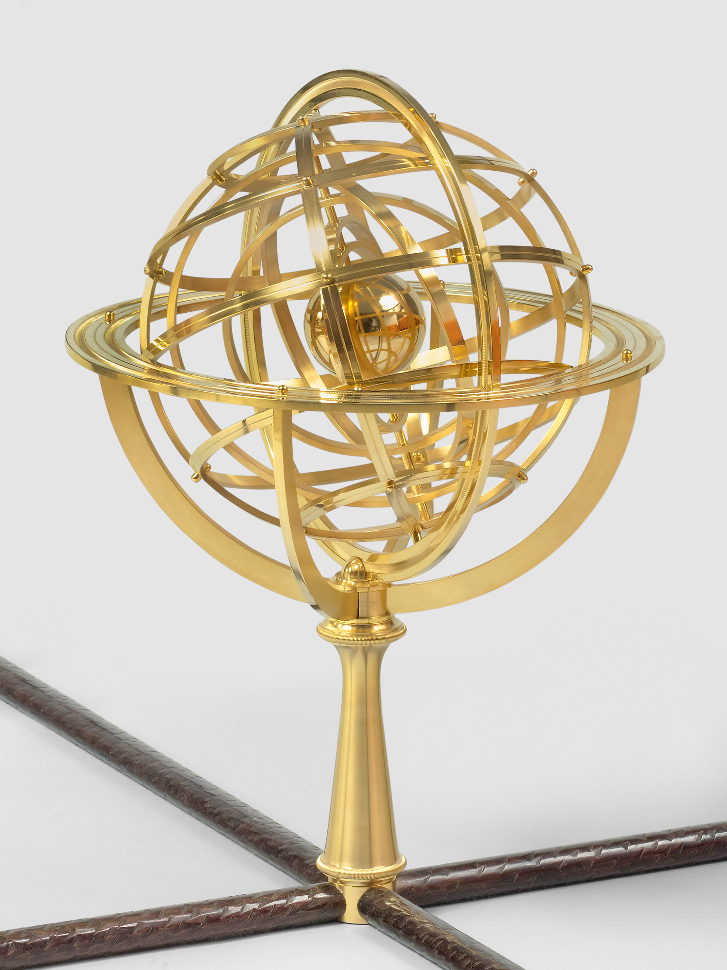 The armillary sphere forms the central motif of this pedestal table. No welding, only mechanical joinery like in jewelry.