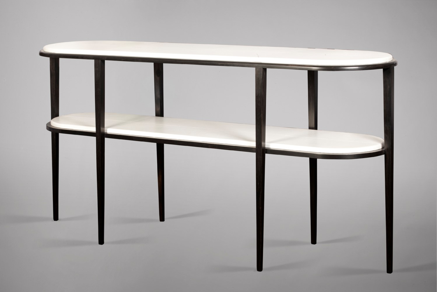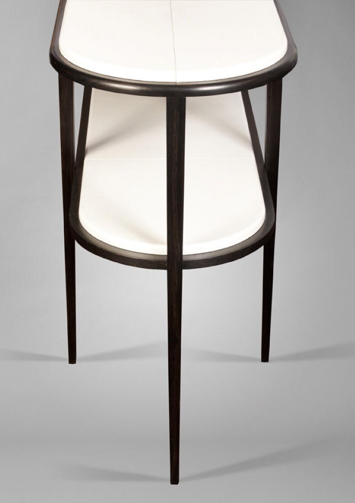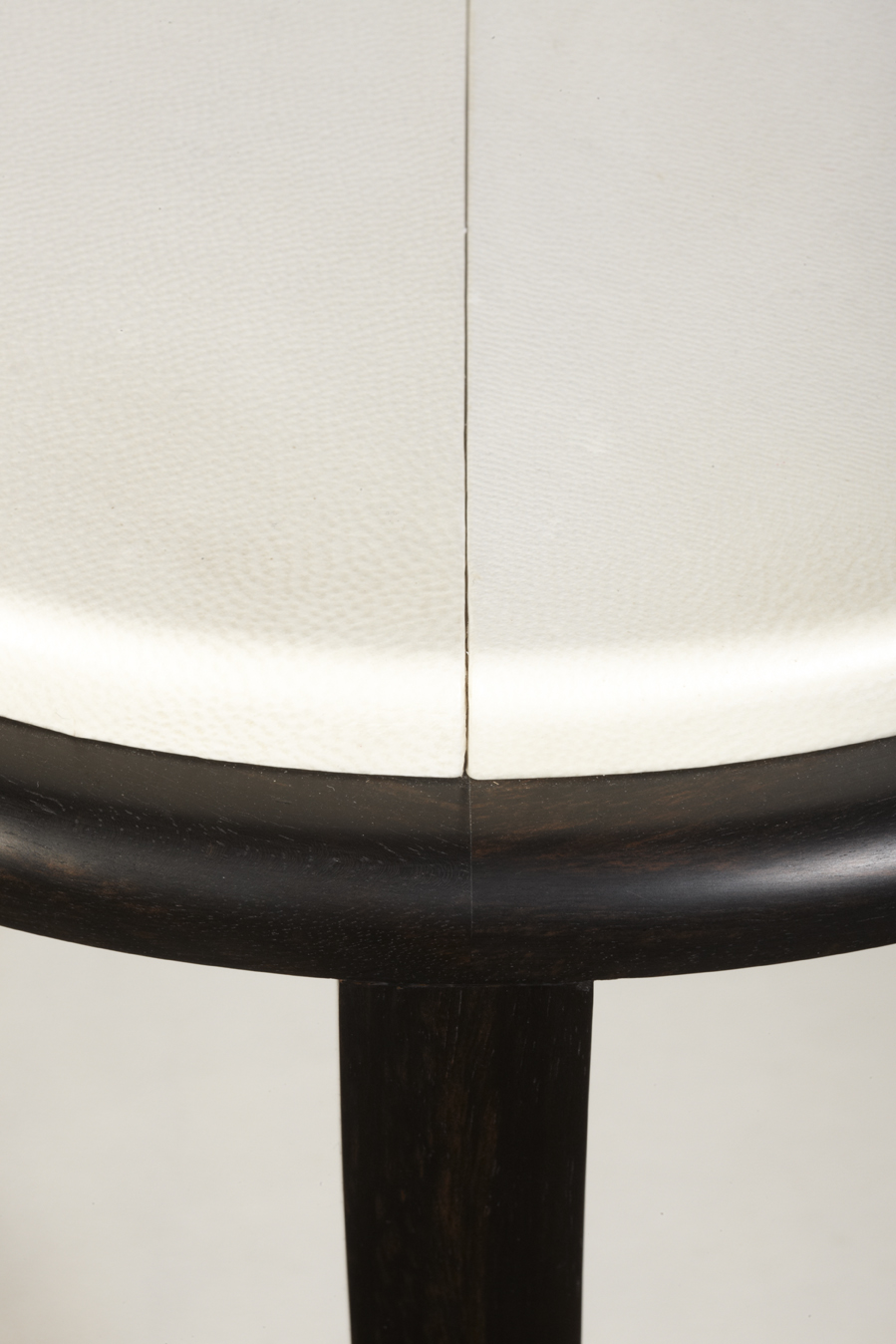 The Lotus console showcases parchment, which requires the expertise of a master cabinetmaker to prepare the parchment skins, select them, cut them and then glue them onto the furniture.