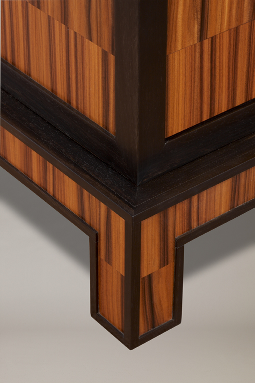 Rosewood is assembled in staggered strips like a papyrus scroll covered with hieroglyphs.