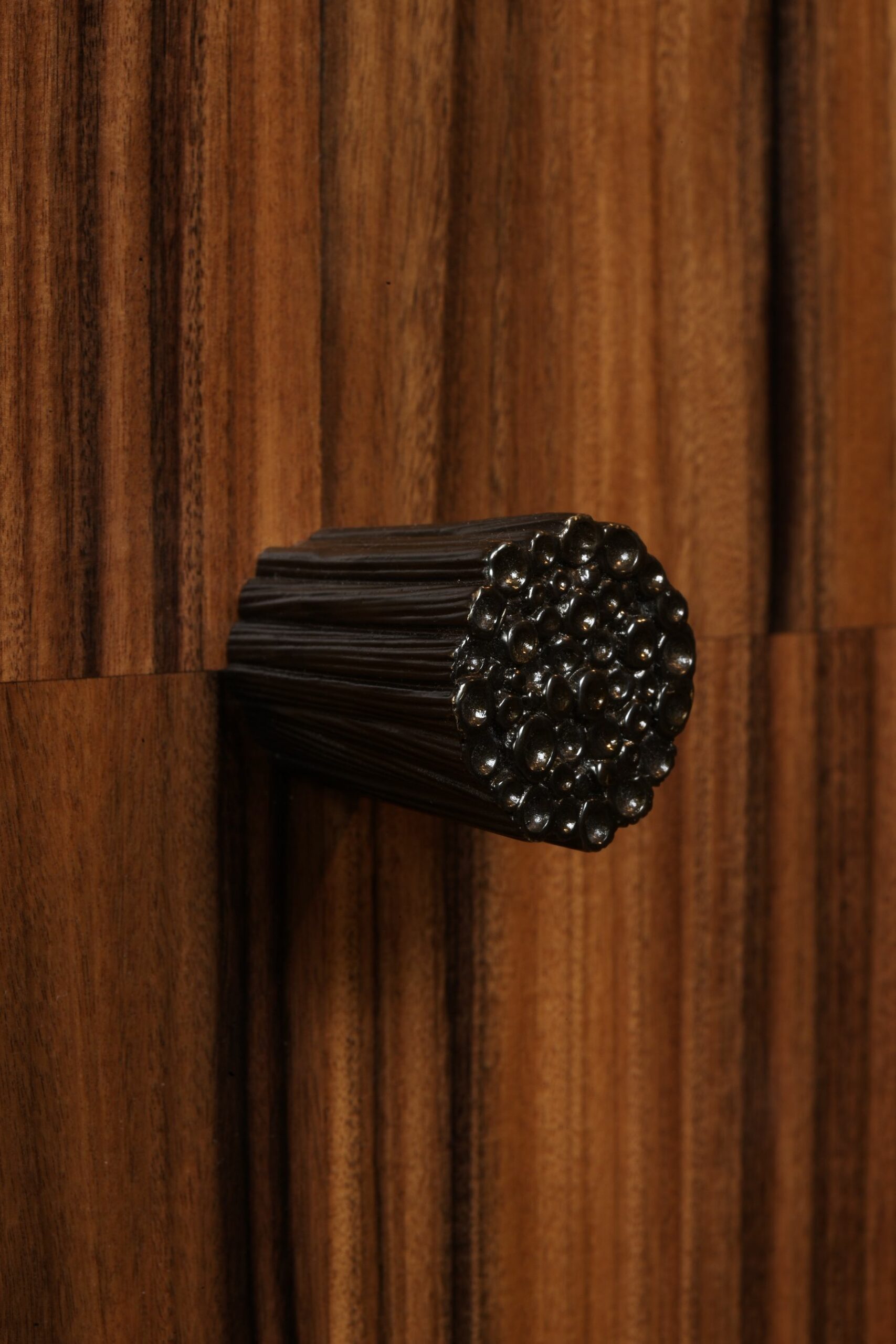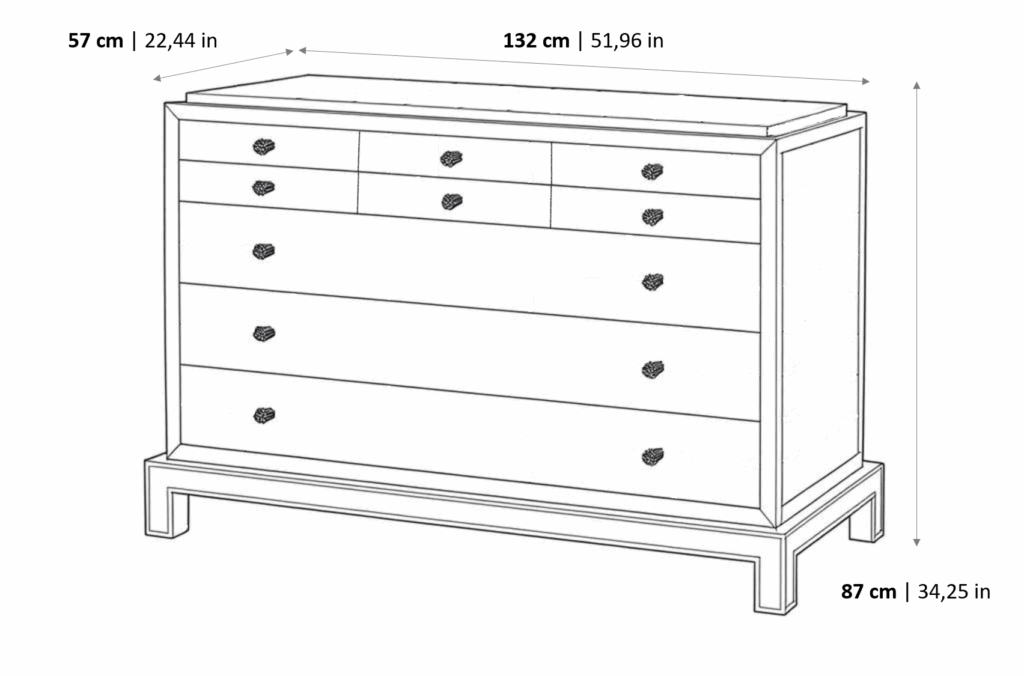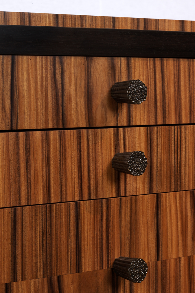 Each drawer of the chest of drawers is adorned with precious chiseled bronze handles that evoke bouquets of papyrus stems.
