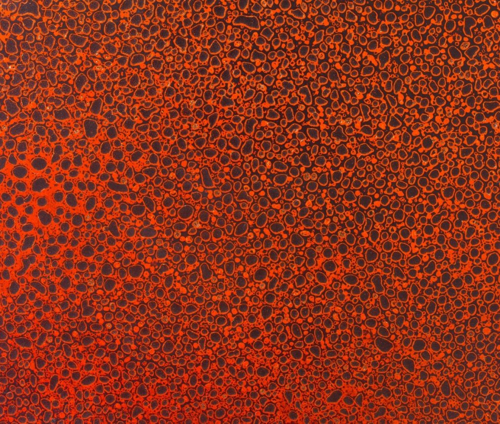 The lacquer is sprayed in drops, and the superimposed layers of different colors reappear as the surface is sanded, creating this flake effect.