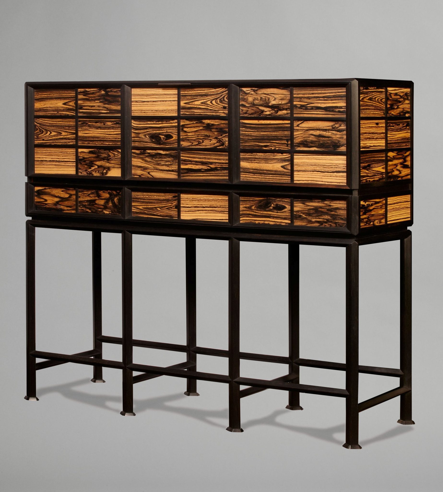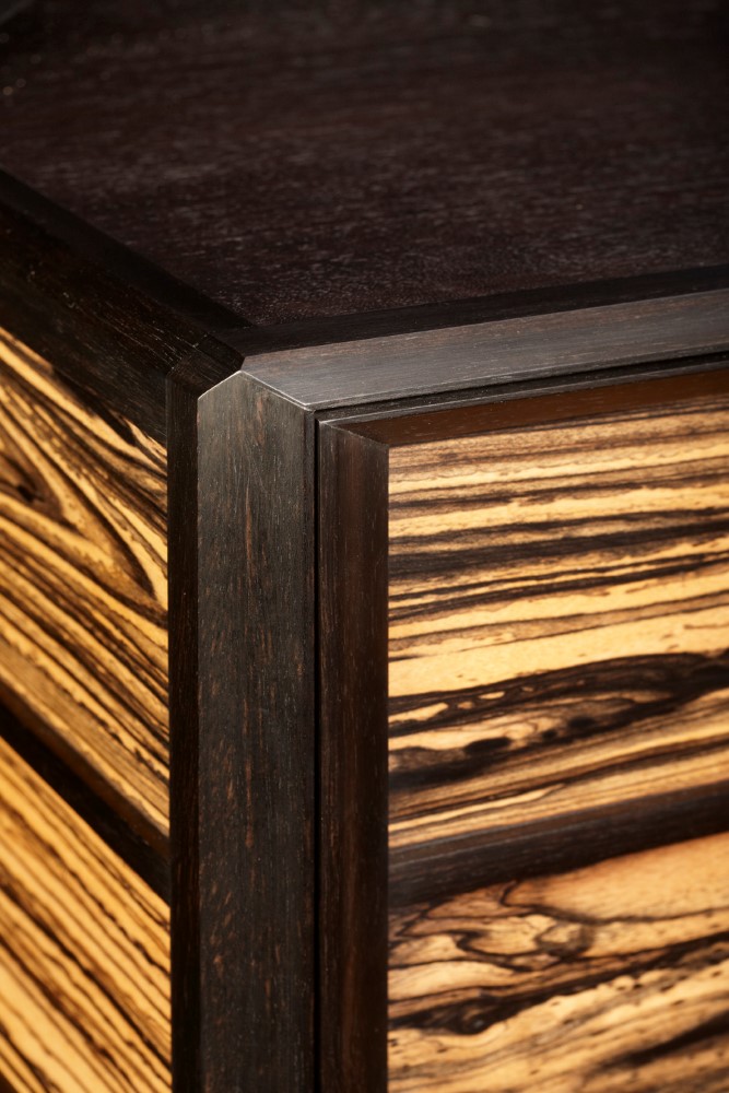 Le « coffre » est revêtu de plaques d’ébène blanc du Laos, un bois rare qui dessine des calligraphies imaginaires.