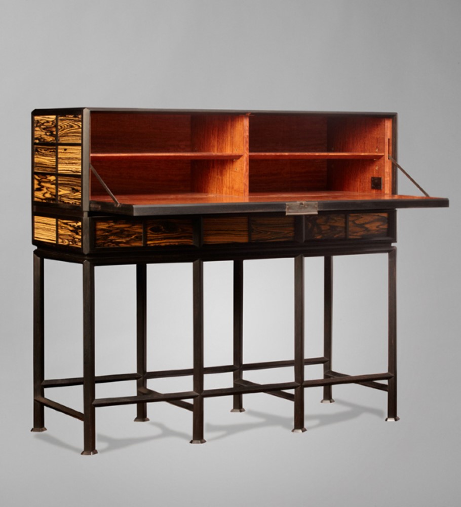 L’intérieur du cabinet se compose de trois tiroirs et d’un secrétaire habillés de Bubinga, un bois exotique parfumé dont les veinures sont ondulées comme une soie plissée…