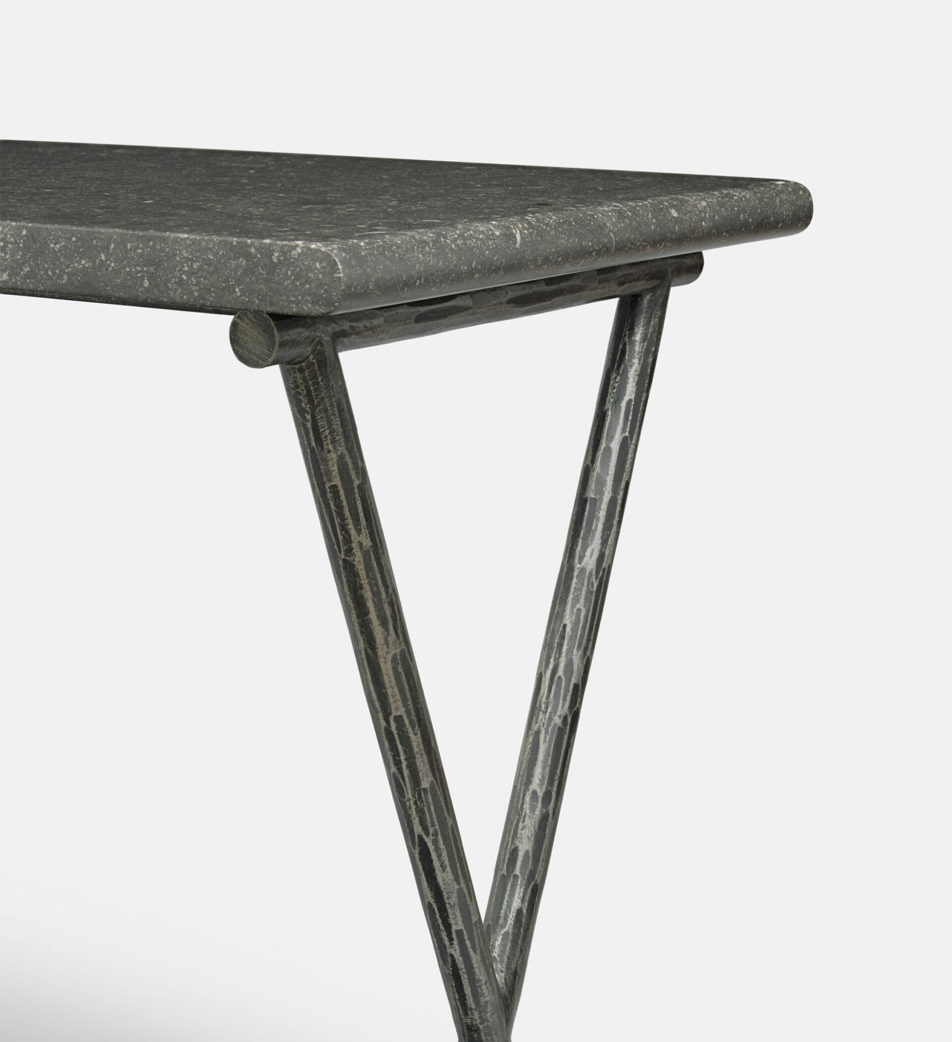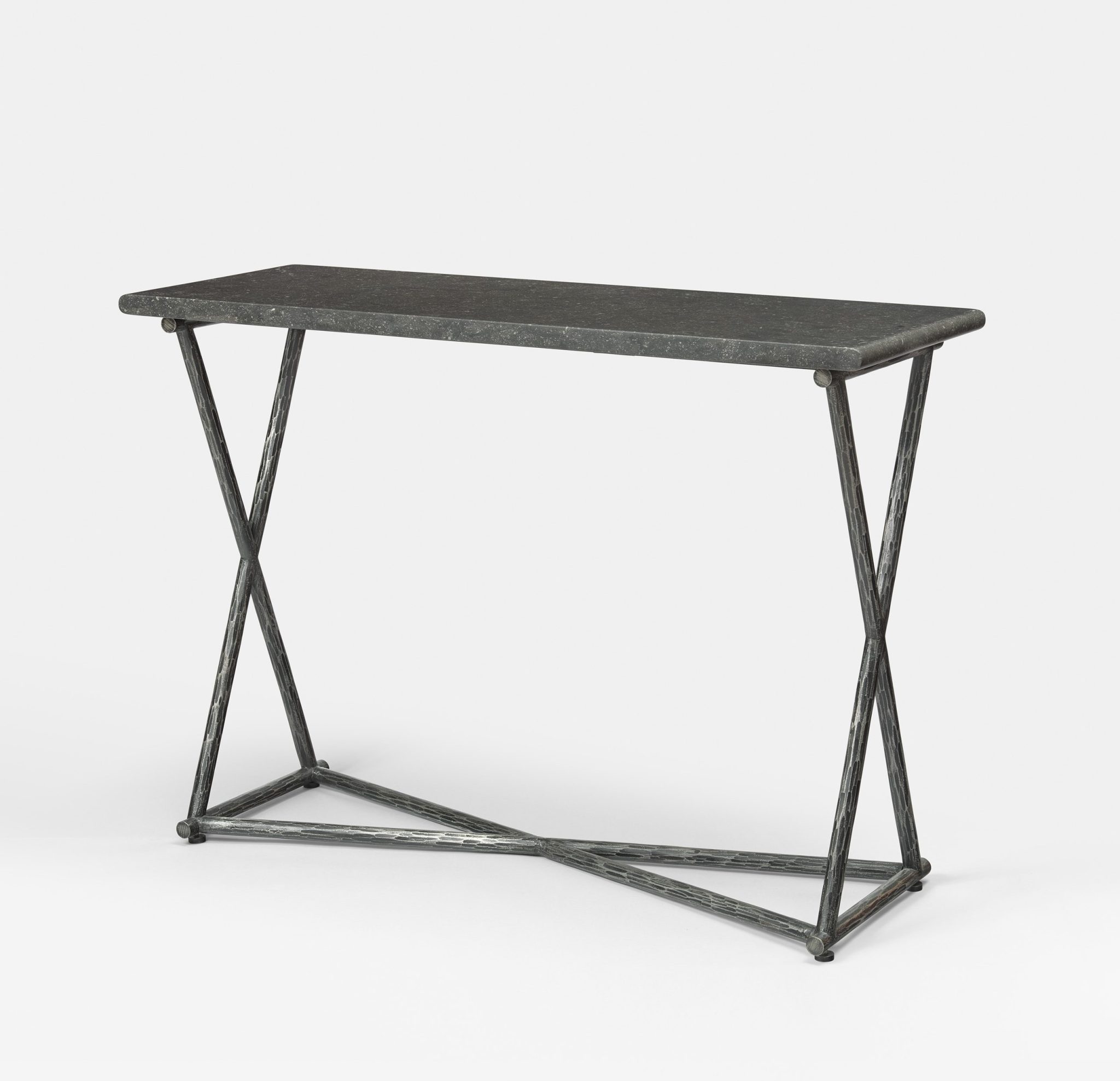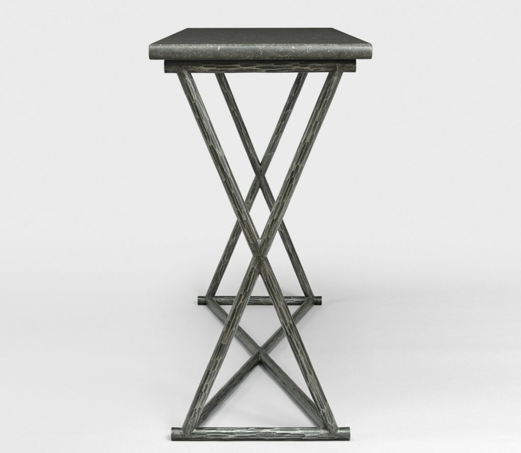 La console Samson met en avant les savoir-faire traditionnels de la ferronnerie avec son piétement en acier forgé et patiné à la main.