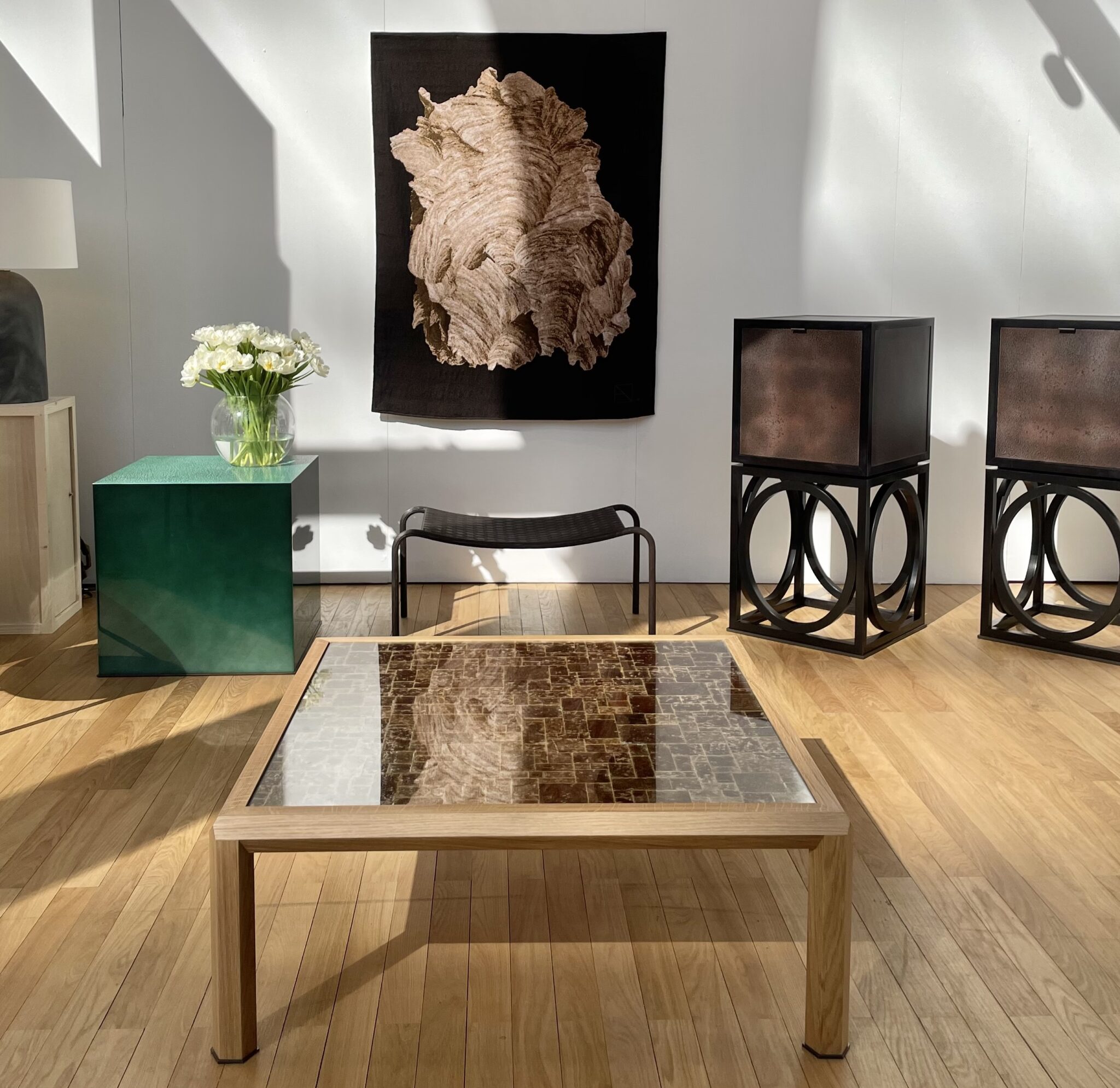 La table basse Sinan est ornée d’une mosaïque de feuilles de mica blond.