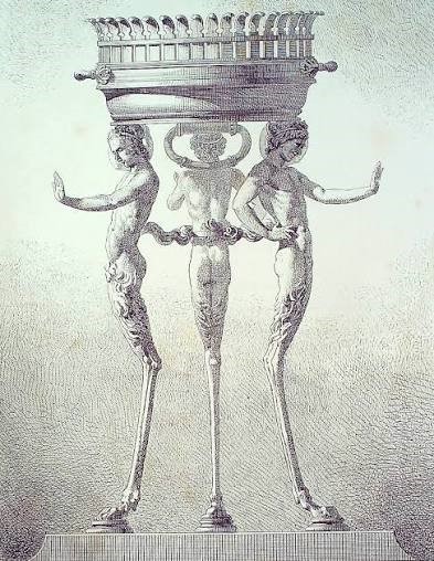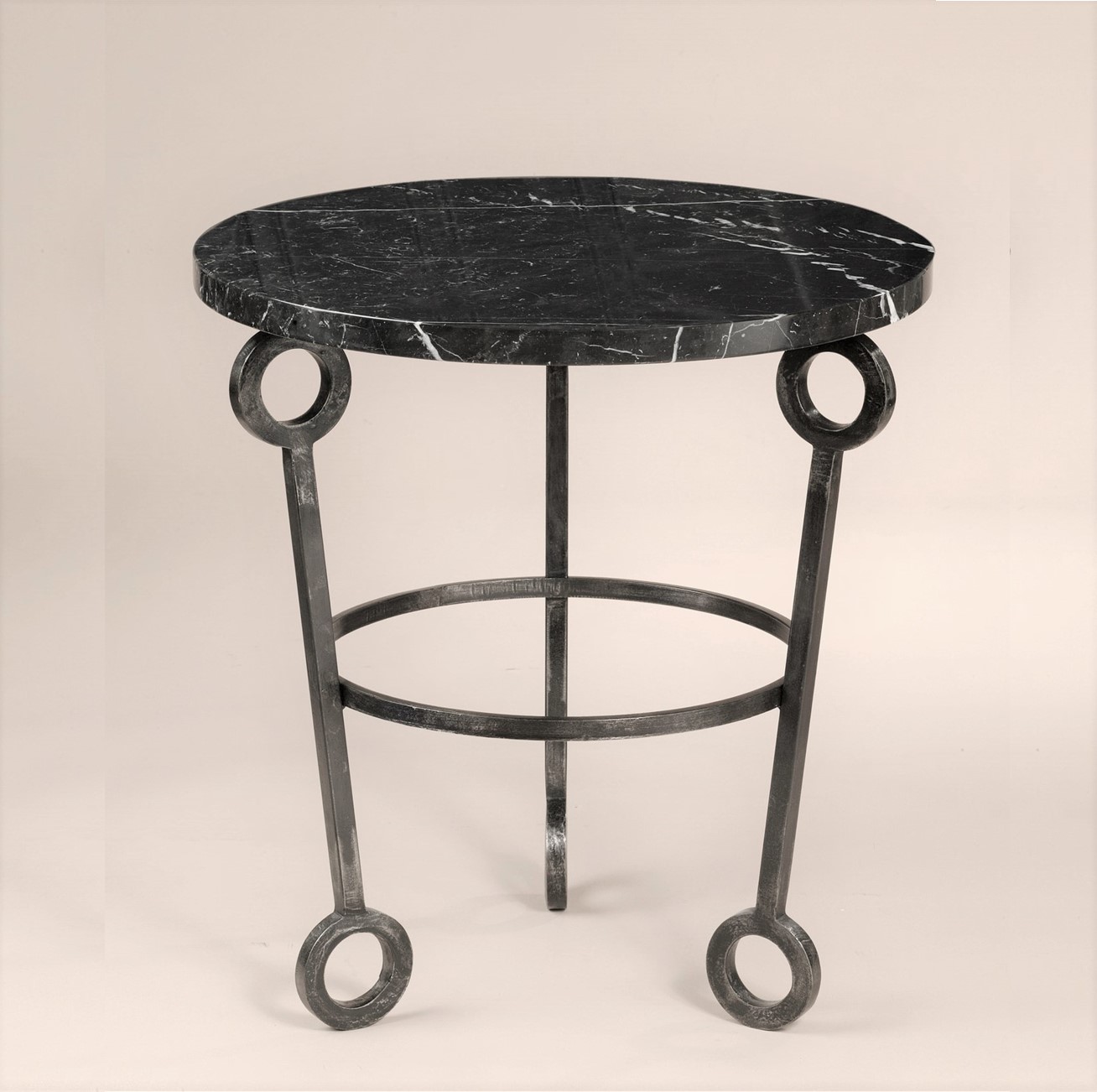 The tripod supporting the stone tabletop is loosely inspired by the "Athenian" pedestals, bronze tables used in antiquity to present and serve festive meals to guests, or to burn incense in their honor…