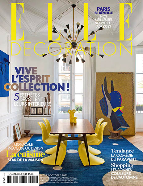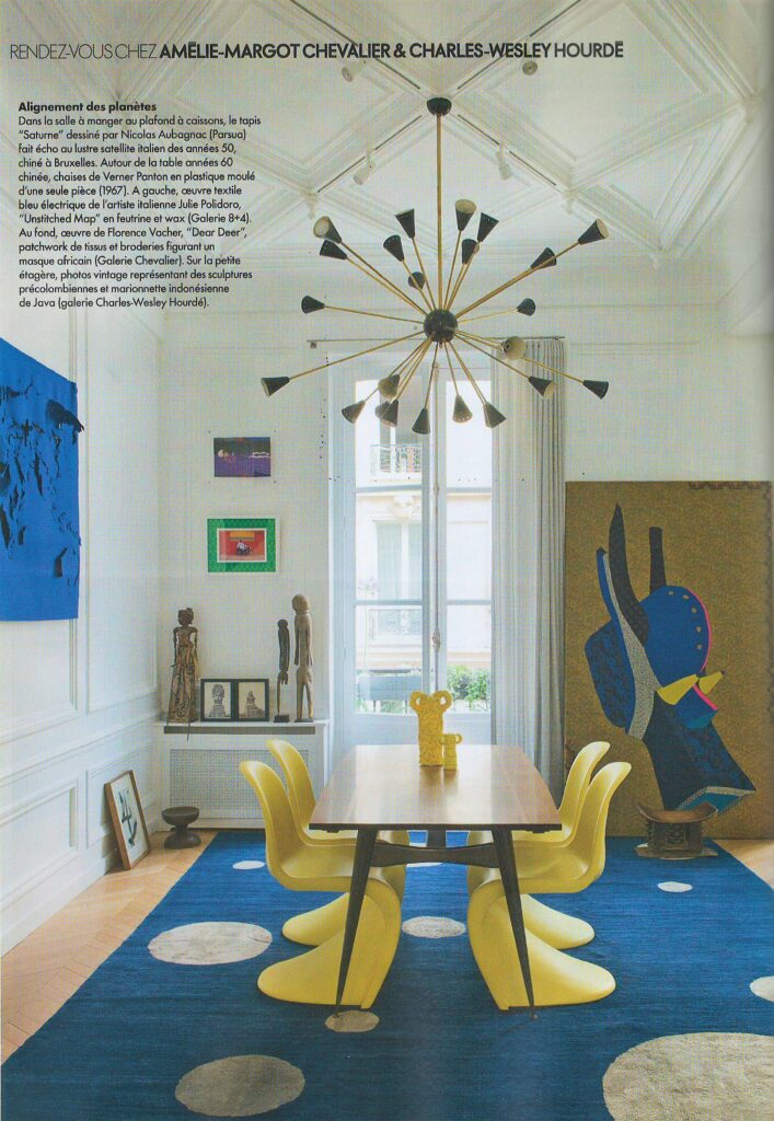 Dans la salle à manger d’un couple de galeriste parisien, le tapis SATURNE fait écho à un lustre satellite italien des années 50.